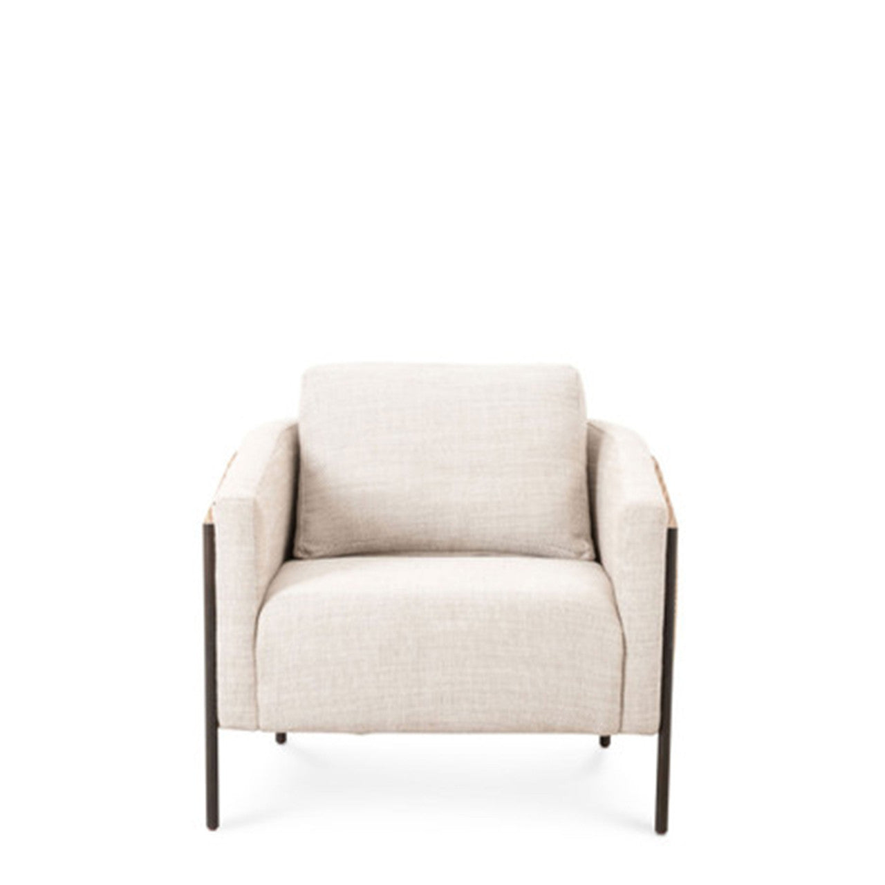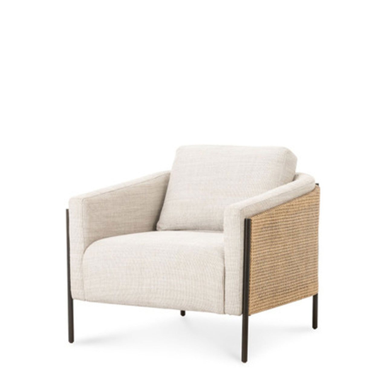 On-trend and expertly tailored, a texture-driven chair is upholstered in exclusive high-performance fabric and wrapped with natural rattan, with linear iron legs finished in a contrasting gunmetal.