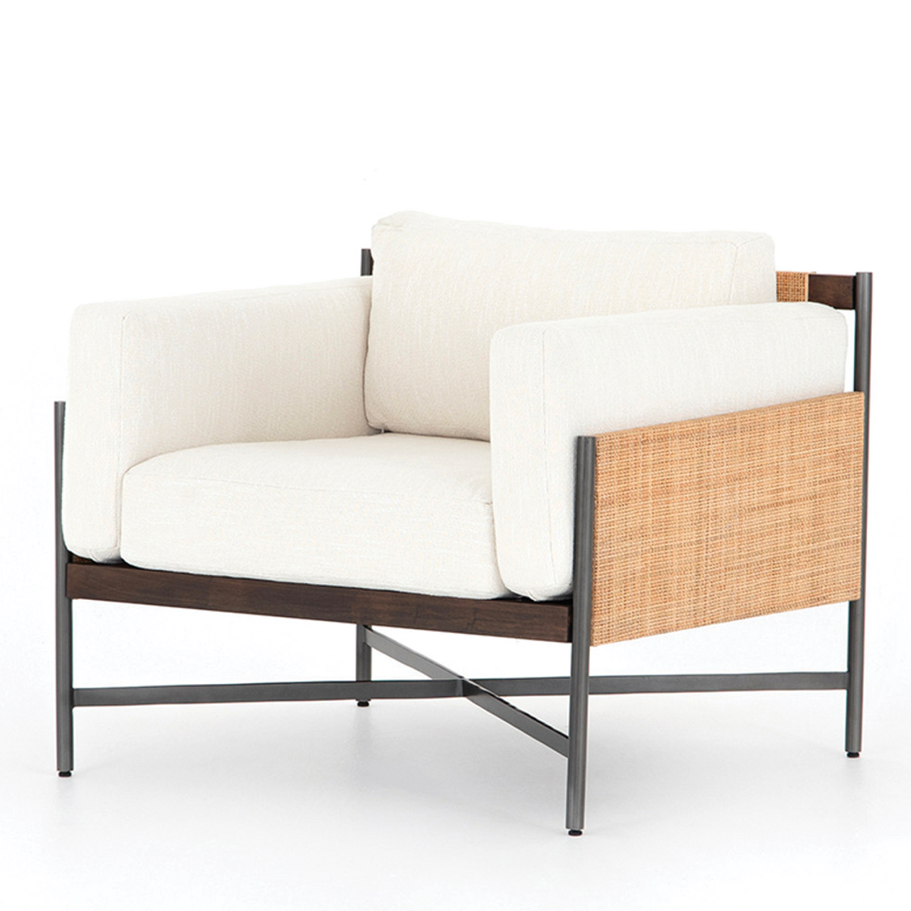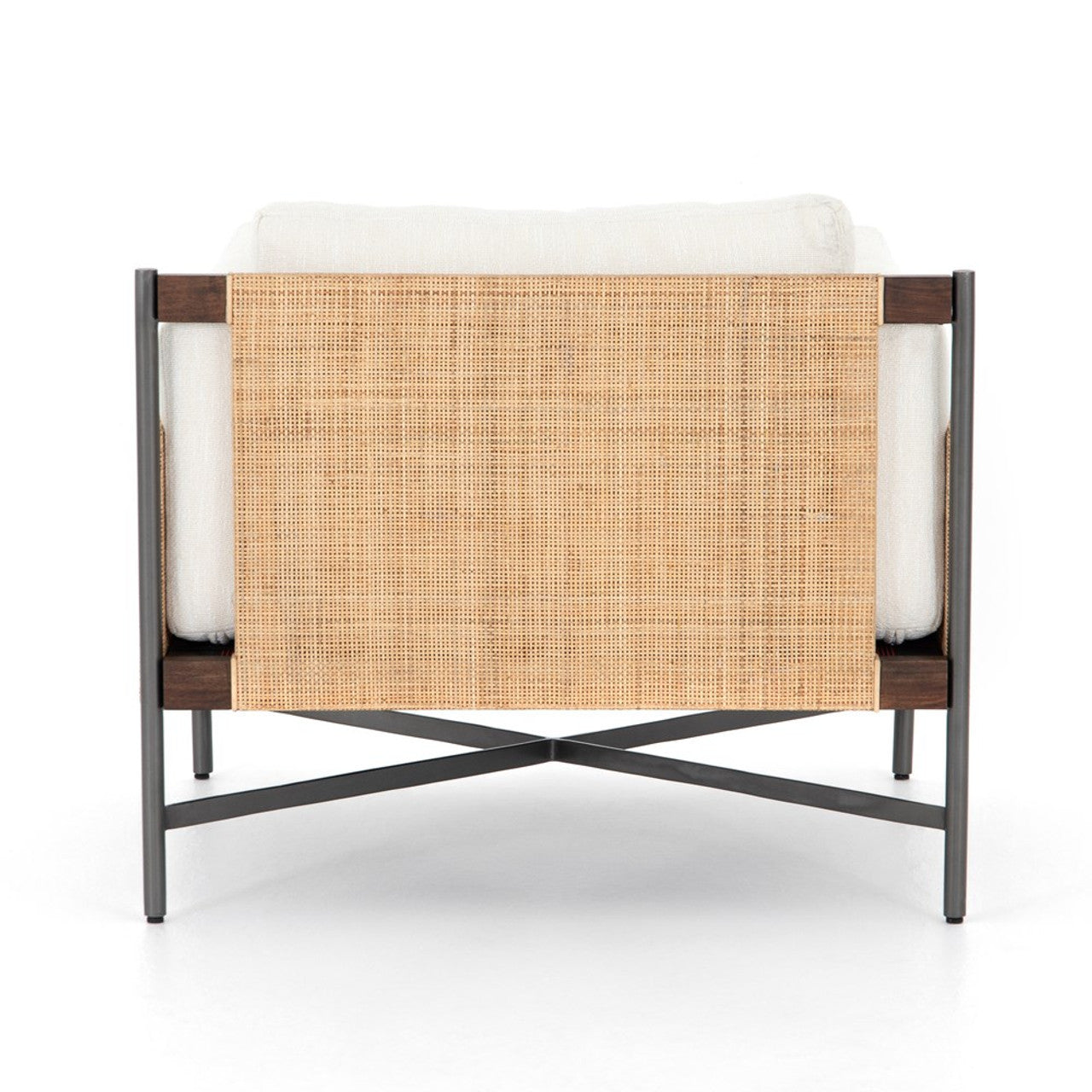 A float-like design brings a lightweight look to modern lounge seating. Natural cane and warm brown mahogany pair with a charcoal-finished iron base for a fresh, refined look with organic presence.