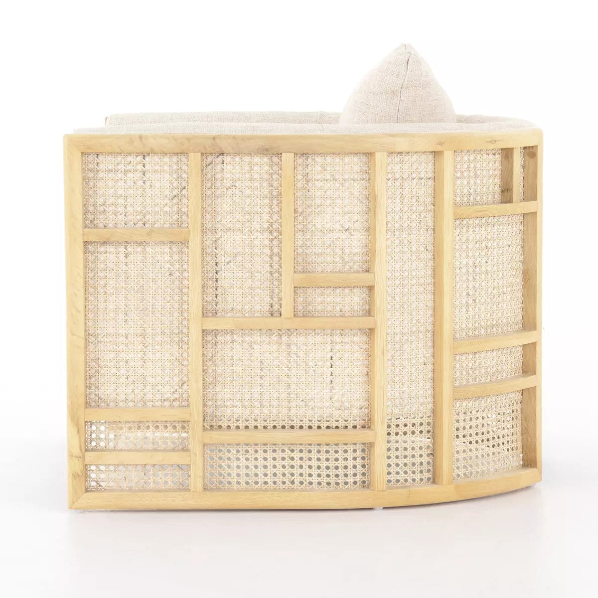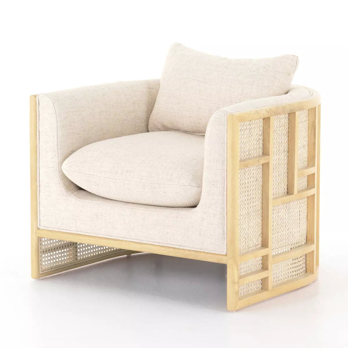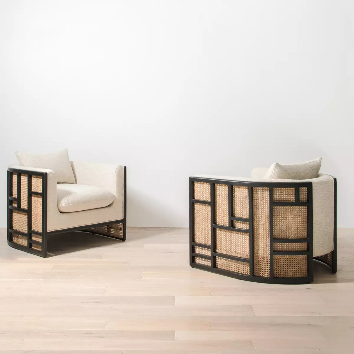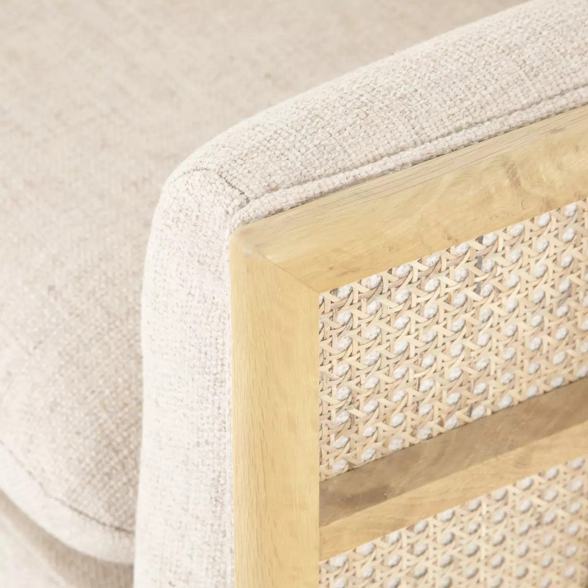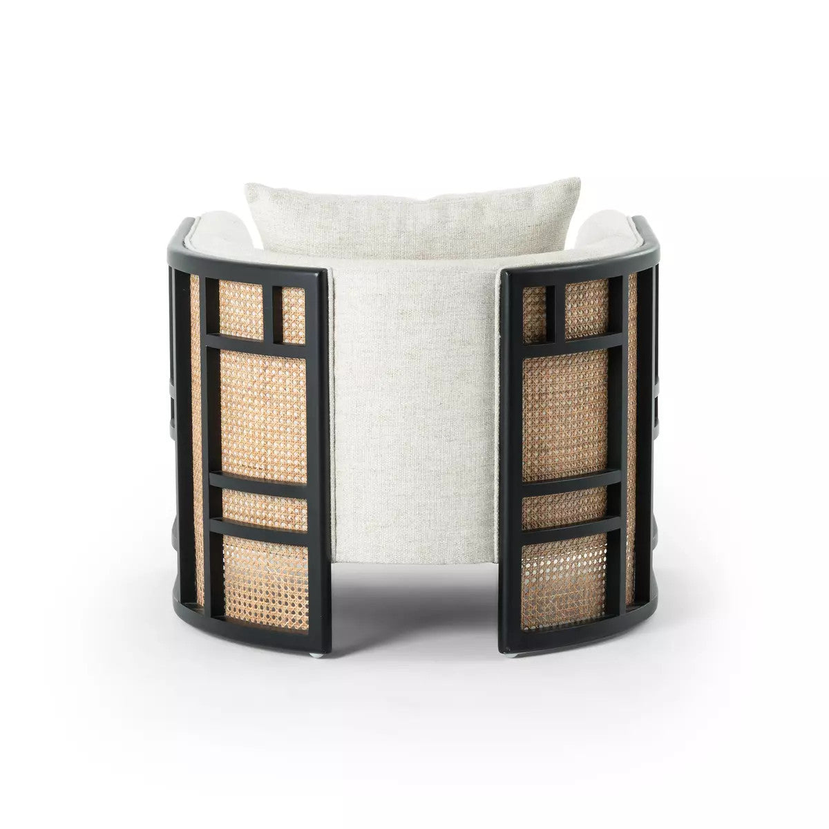 Textural and curve driven. Inspired by Japanese Tatamis, a cleverly constructed outer frame consists of rattan and natural cane paneling. For a clean, monochromatic look sits cream linen-blend performance seating exclusive to Four Hands, with one knife-edge pillow for extra comfort.