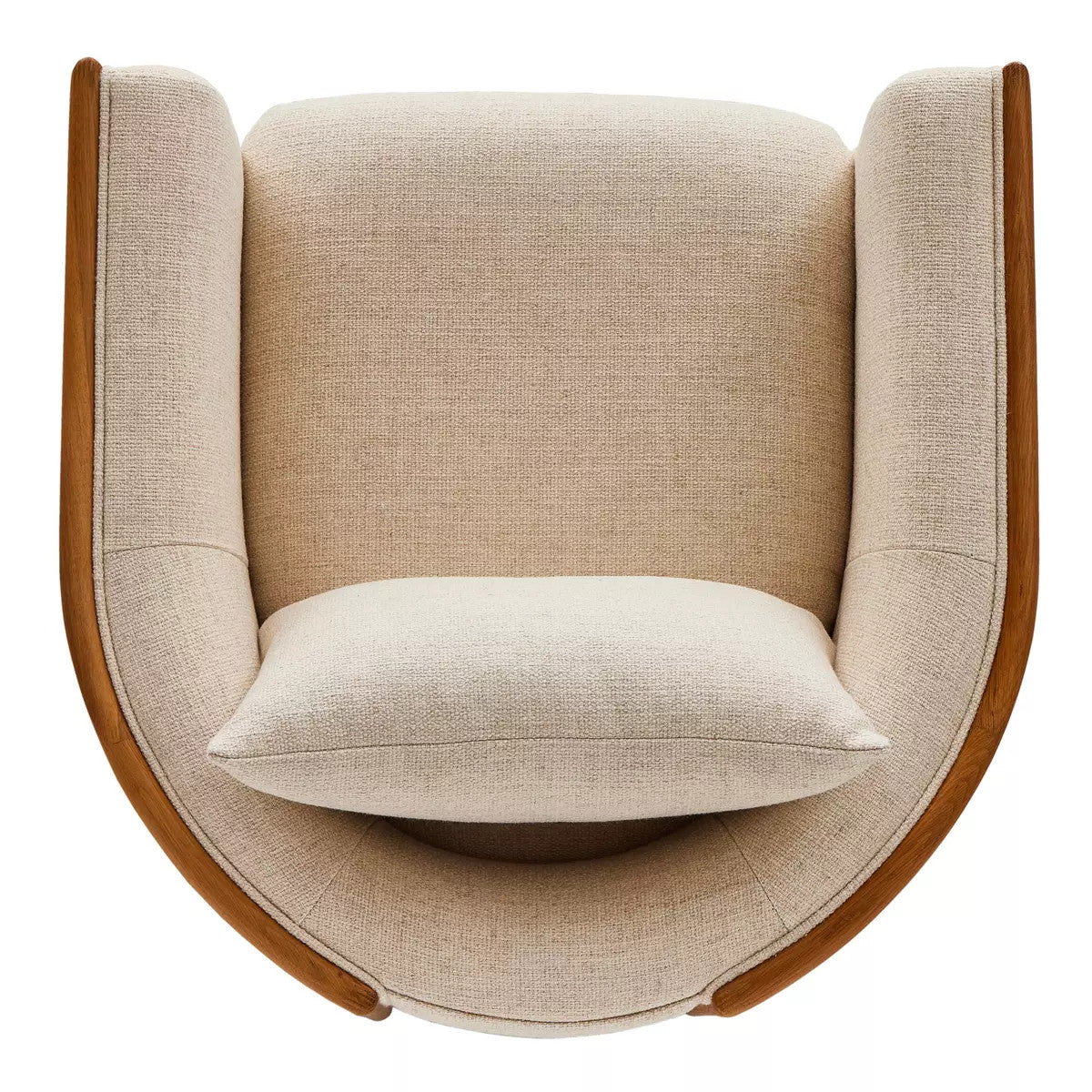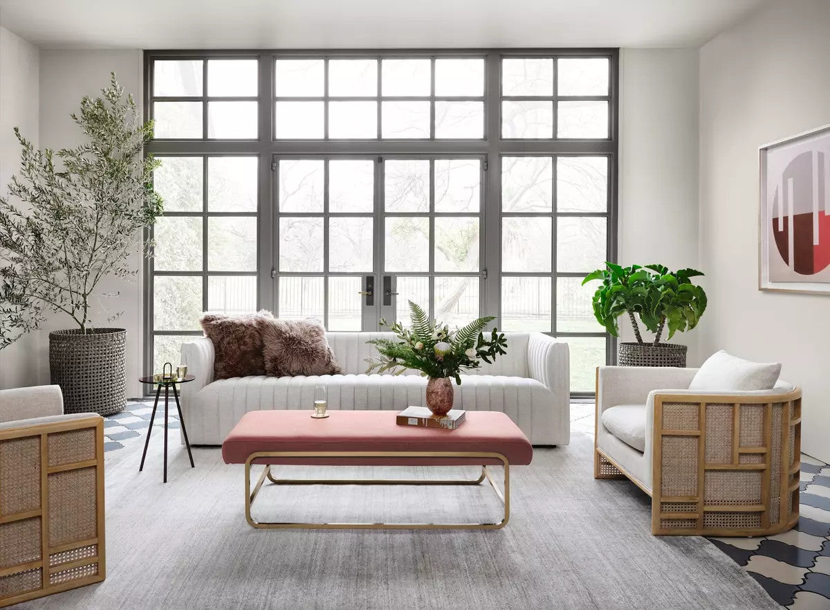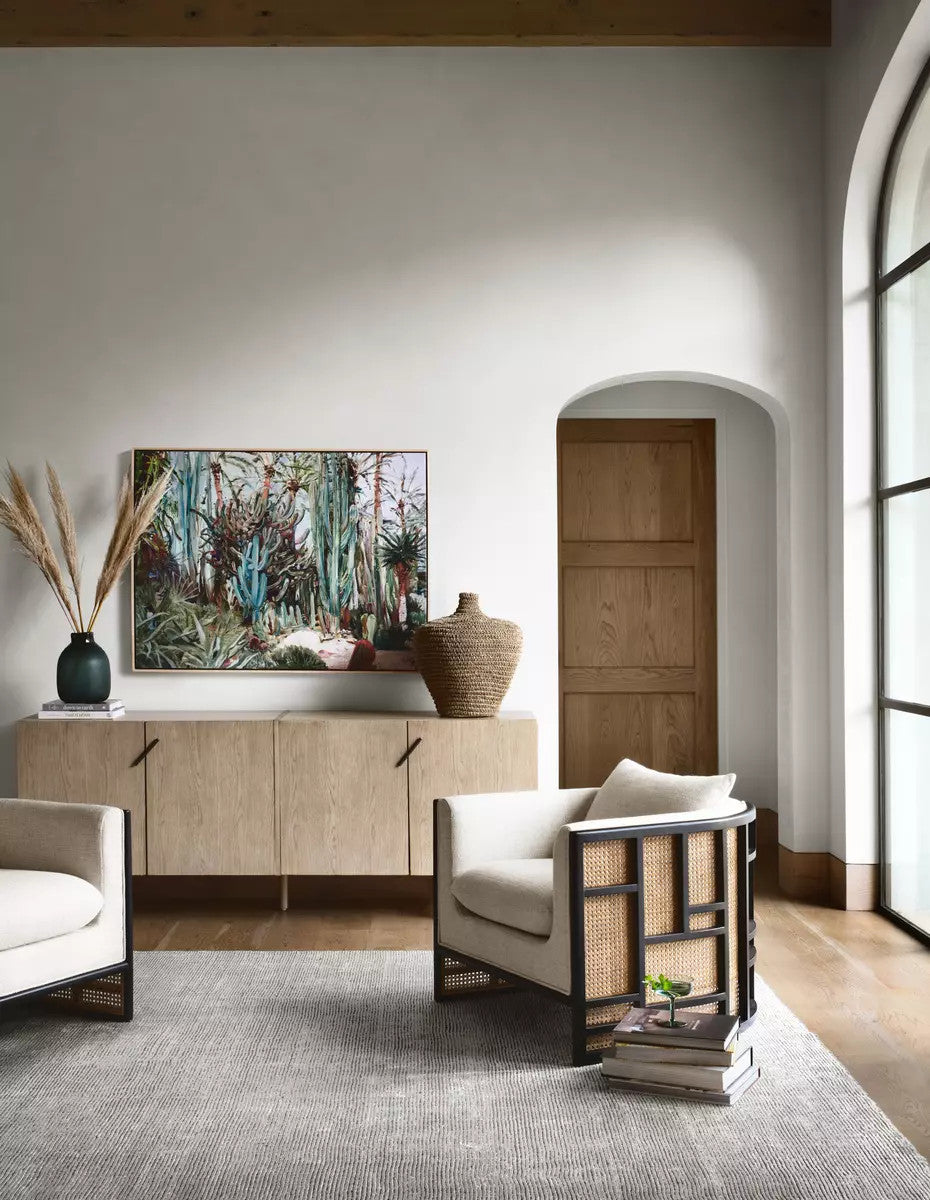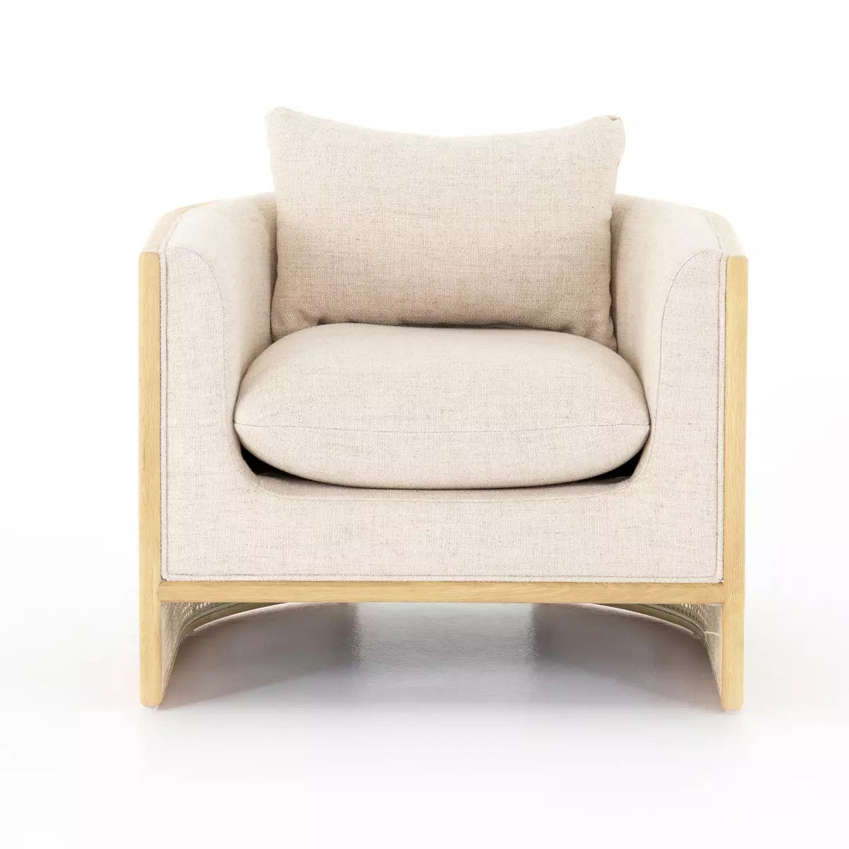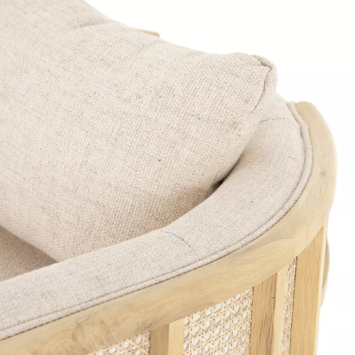 Textural and curve driven. Inspired by Japanese Tatamis, a cleverly constructed outer frame consists of rattan and natural cane paneling. For a clean, monochromatic look sits cream linen-blend performance seating exclusive to Four Hands, with one knife-edge pillow for extra comfort.