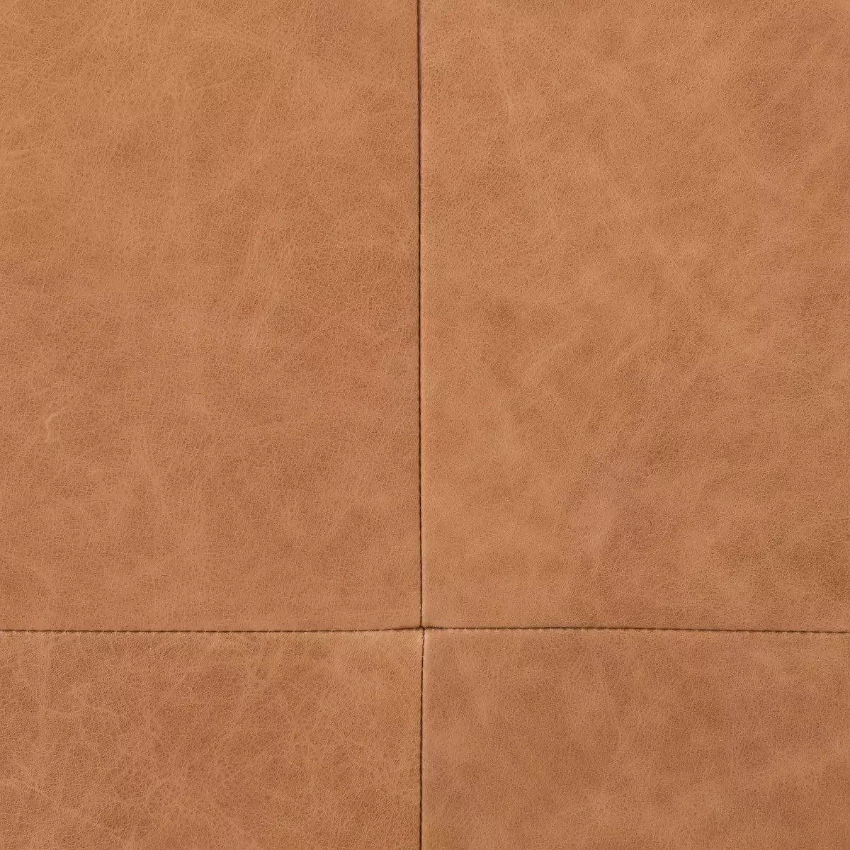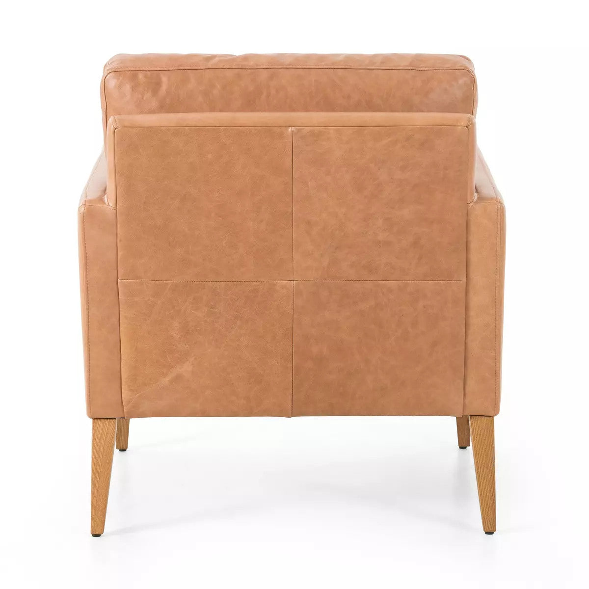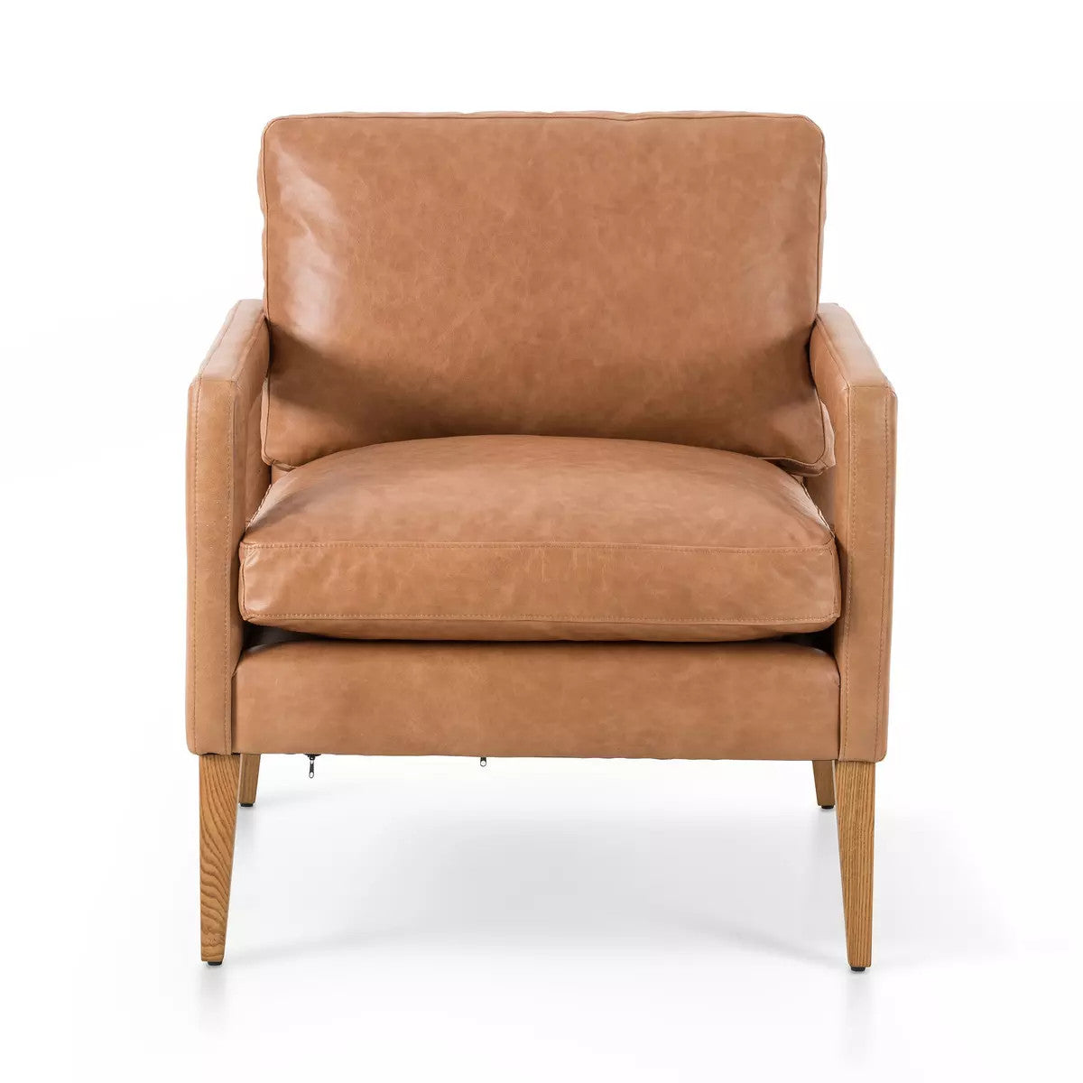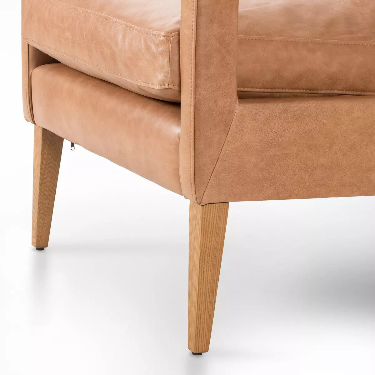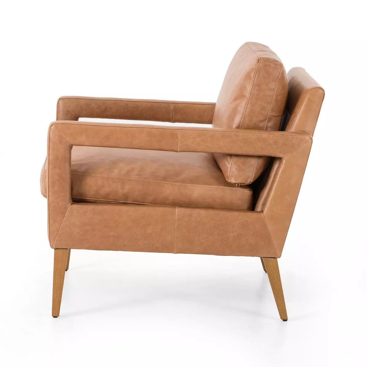 A clean, sophisticated silhouette meets butterscotch top-grain leather with side-arm cutouts, for a balanced look with midcentury vibes. Finished with tapered oak legs.