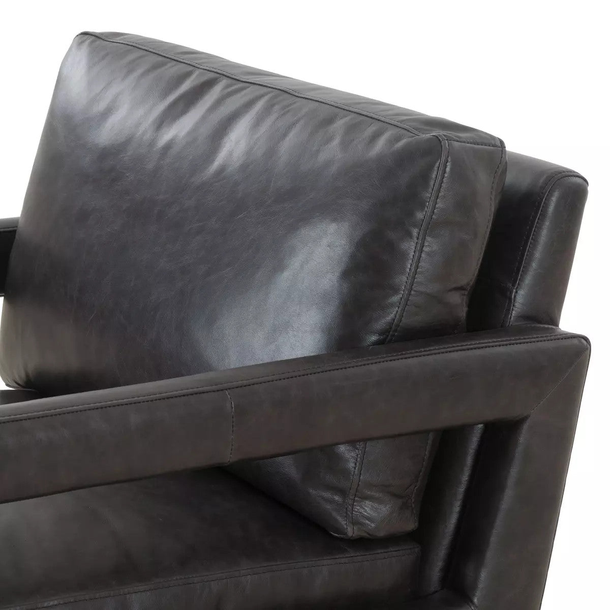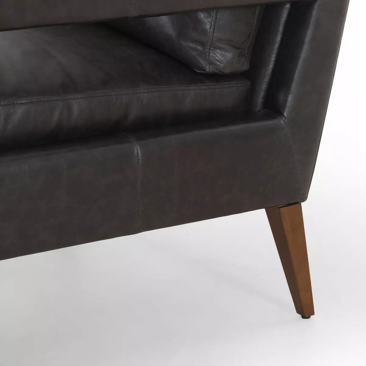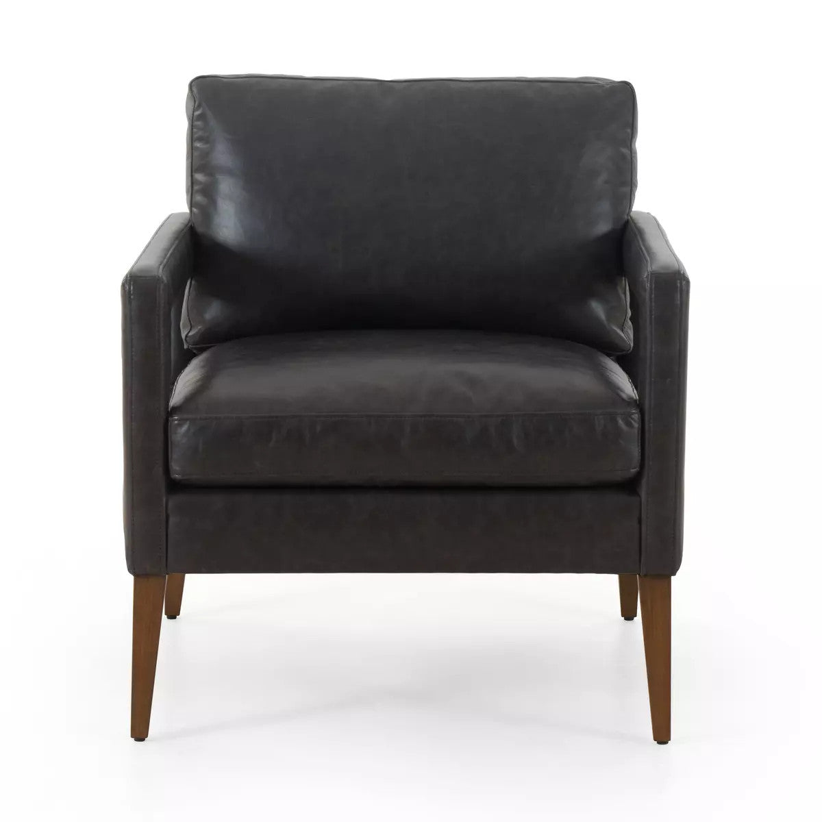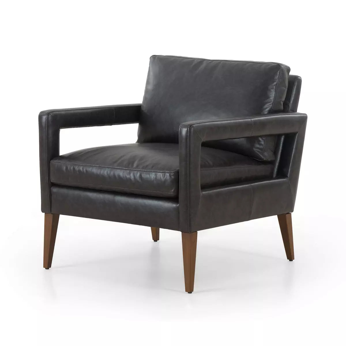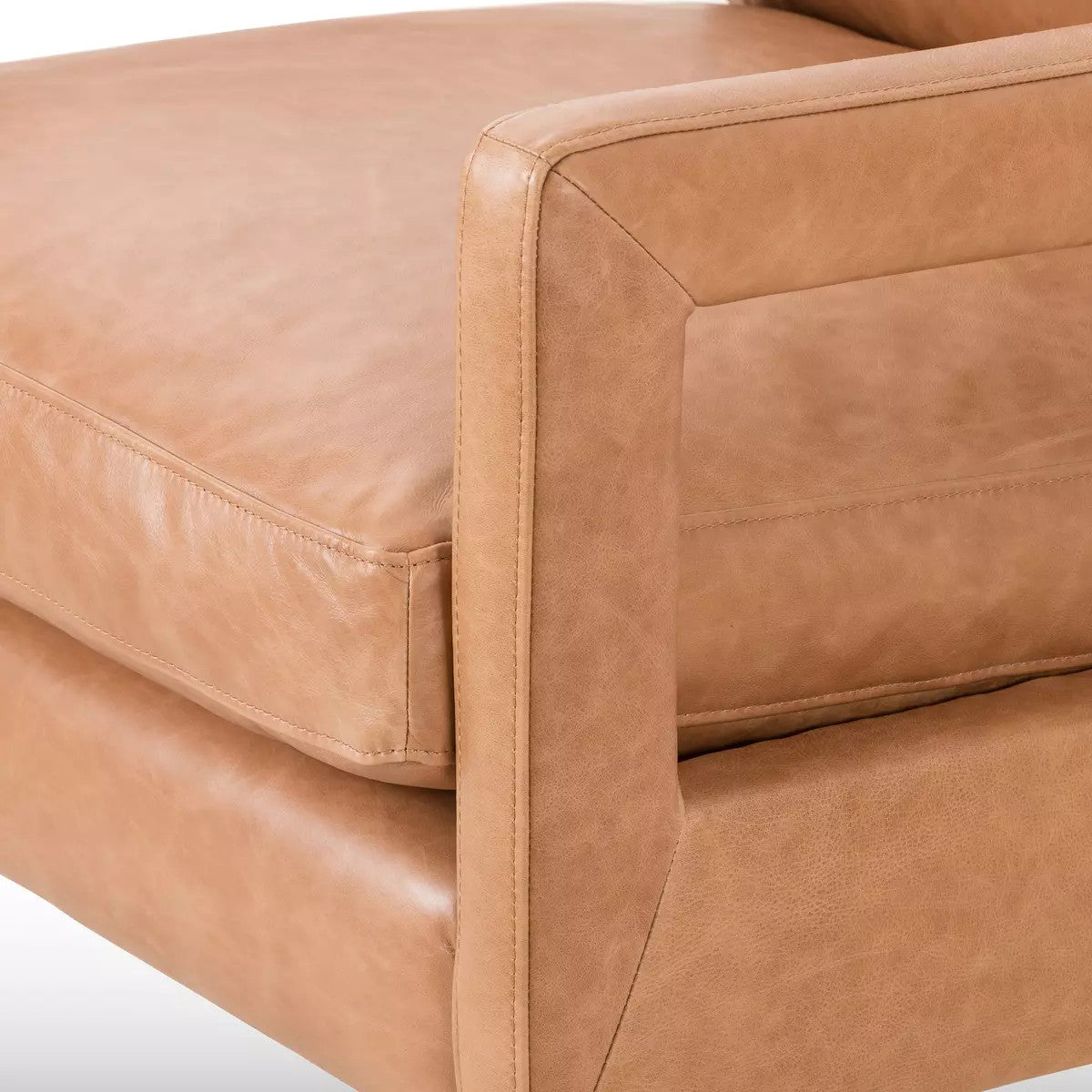 A clean, sophisticated silhouette meets butterscotch top-grain leather with side-arm cutouts, for a balanced look with midcentury vibes. Finished with tapered oak legs.