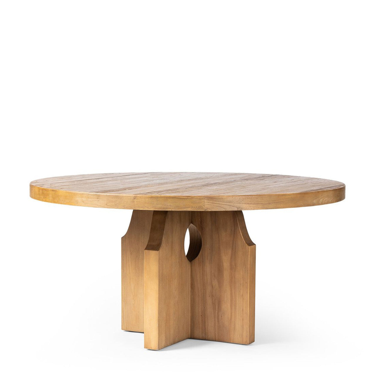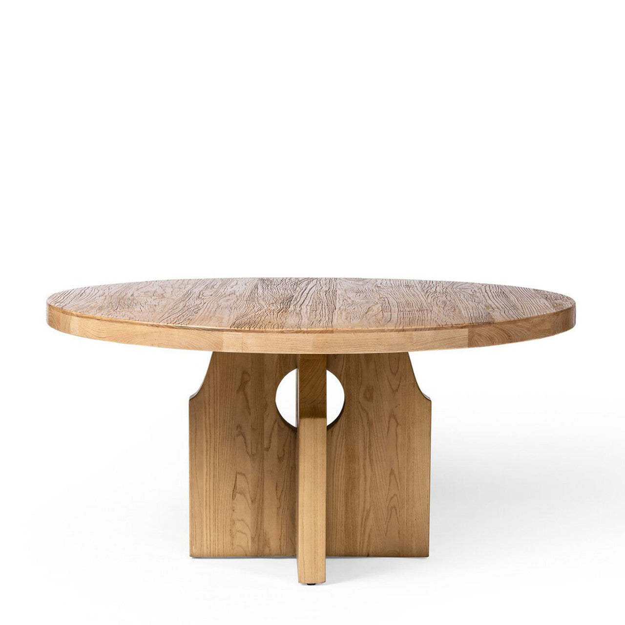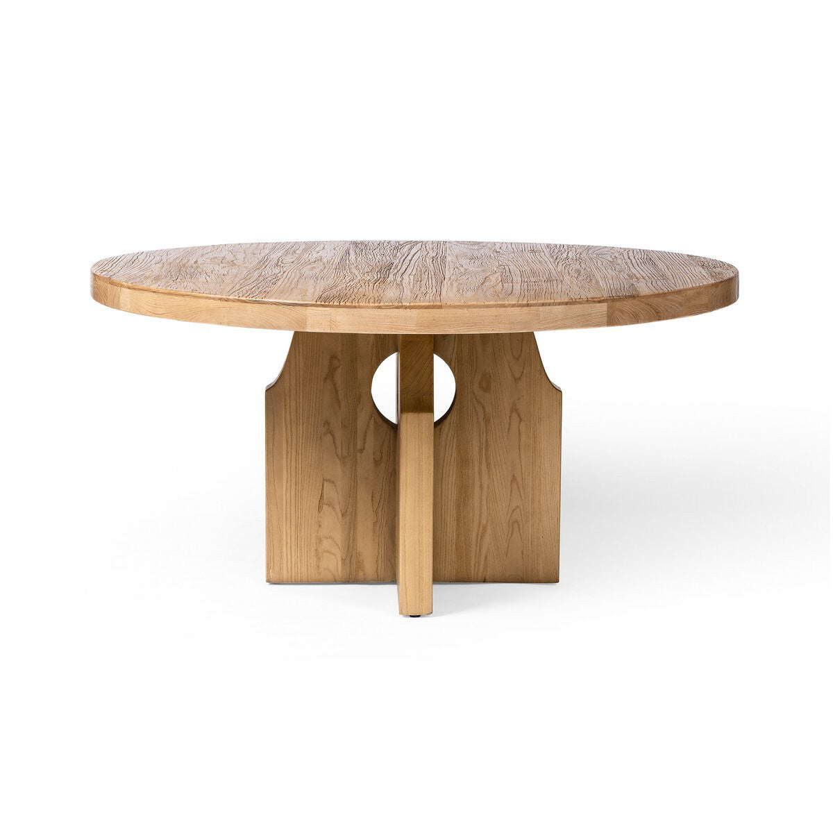 Made from natural elm with wire brushing for texture, a rounded tabletop and cutout base speak to Swedish Gustavian design influence. Seats six comfortably.