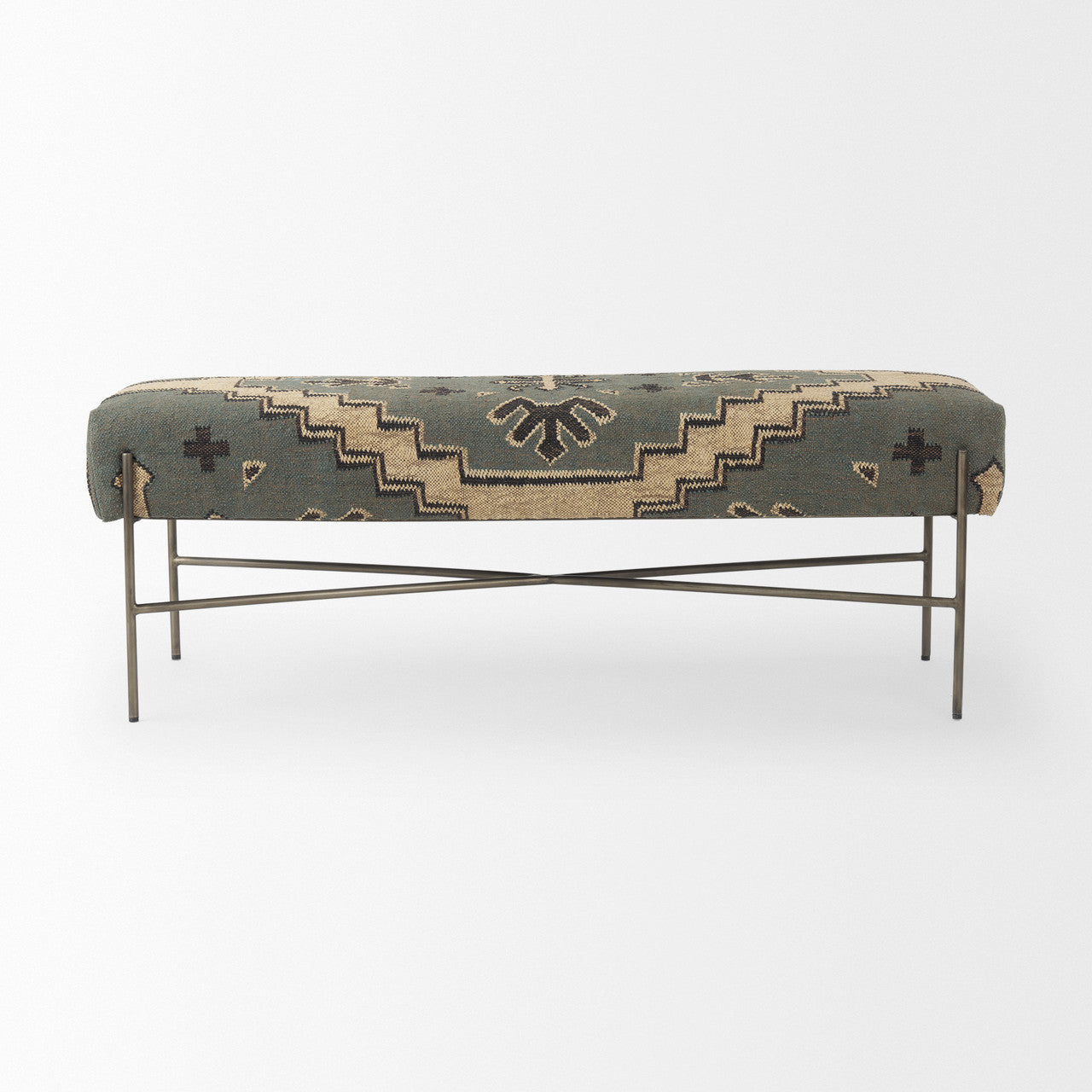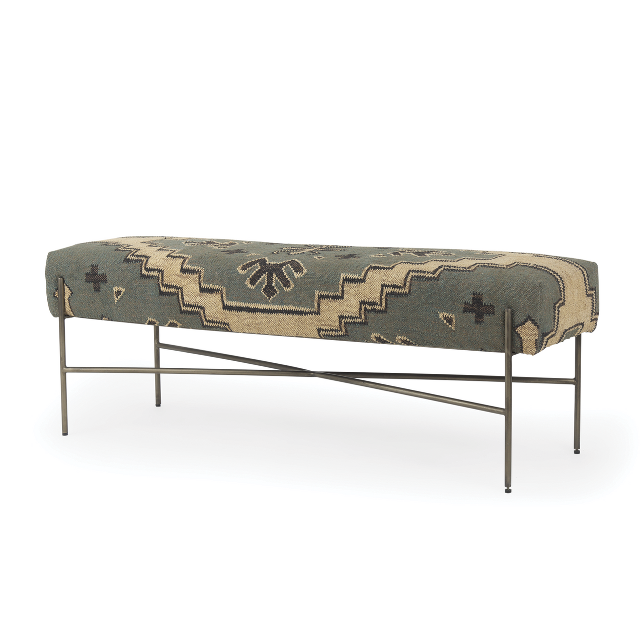 Featuring a hand-upholstered, perfectly cushioned seat rested atop a four-legged, metal base with cross-bracing, the Avery I is a chic accent bench that is guaranteed to add a touch of color and pattern to your space. The top, upholstered in greenish-blue fabric with unique patterns in a tan color, complements the antiqued-nickel toned metal base and adds to the visuals of this stylish bench. This juxtaposition of materials and colors makes the Avery I accent bench a gorgeous addition to spaces based on the Global Curiosities design style.