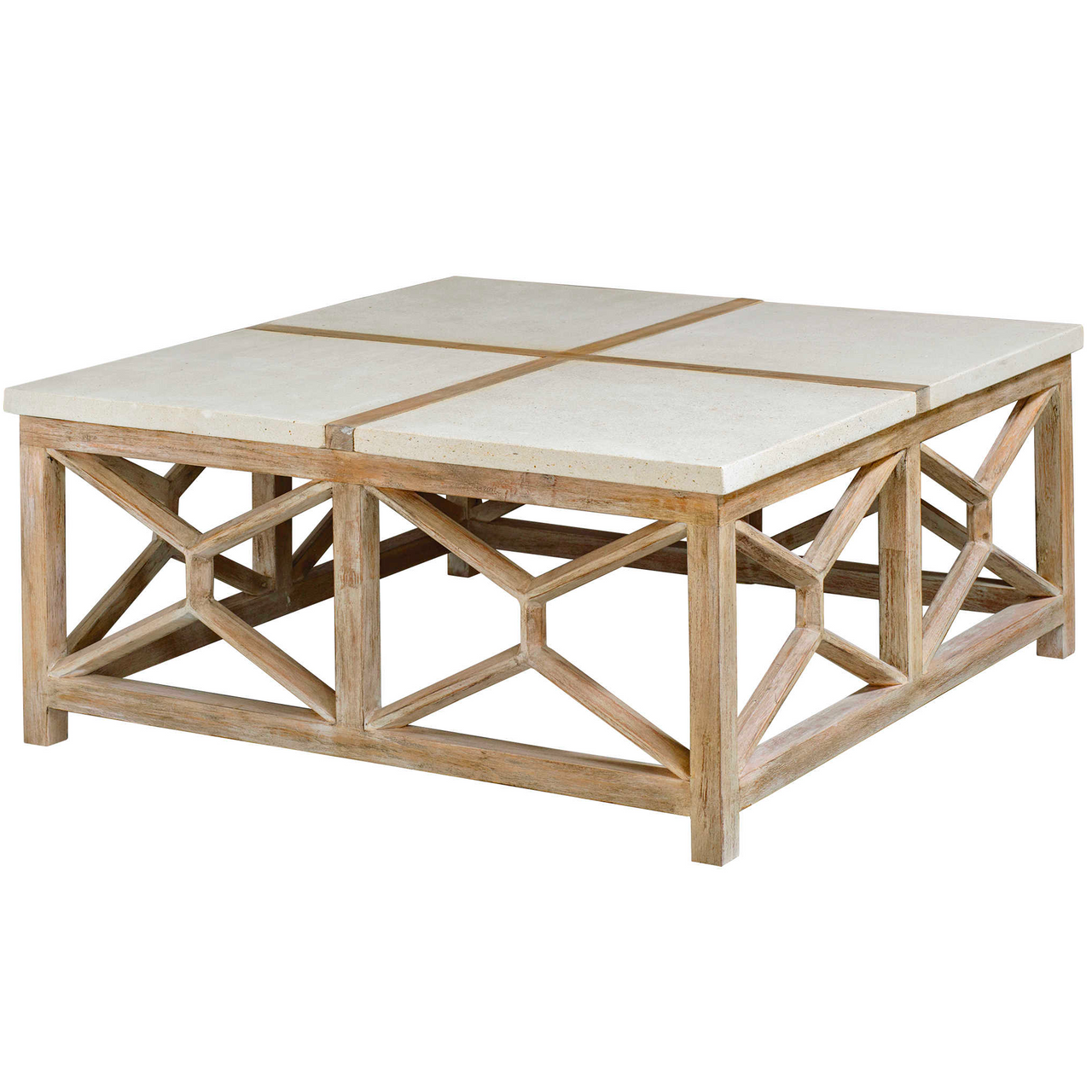 Handcrafted from solid mixed woods with an natural ivory limestone top, on a geometric base finished in a warm oatmeal wash. True to the characteristics of natural stone, each piece will have unique coloration and veining. Solid wood will continue to move with temperature and humidity changes, which can result in cracks and uneven surfaces, adding to its authenticity and character.