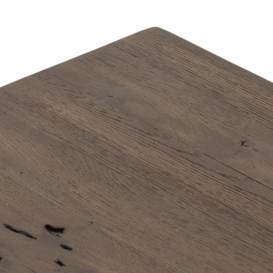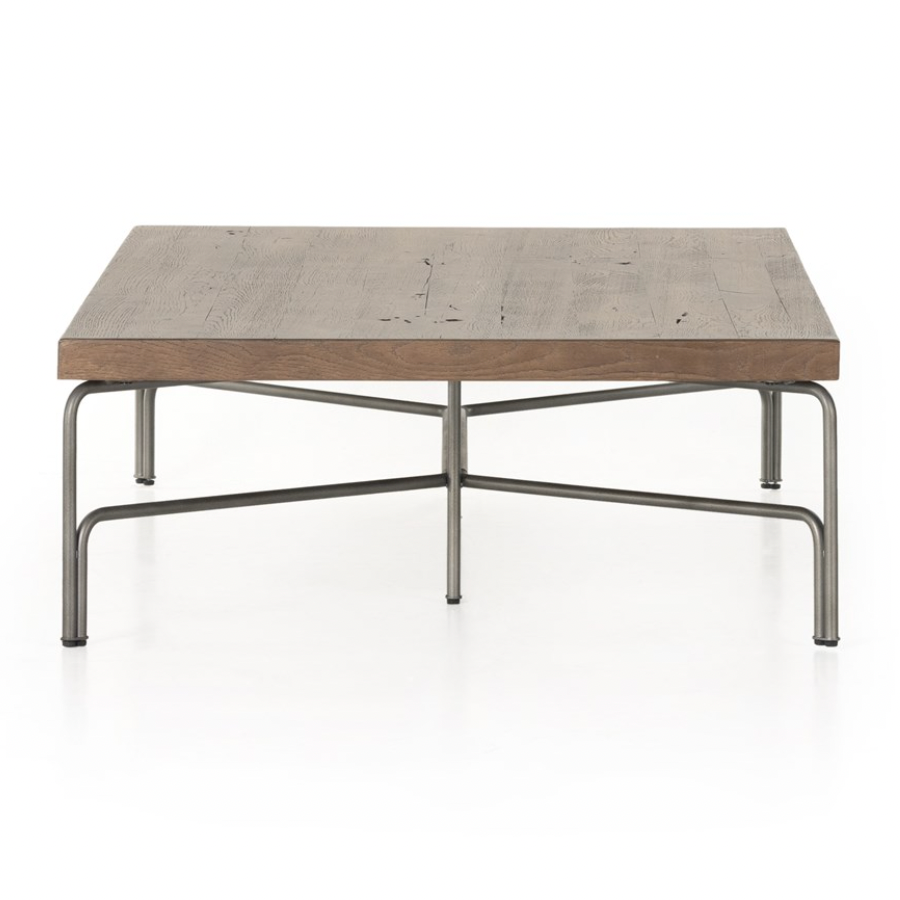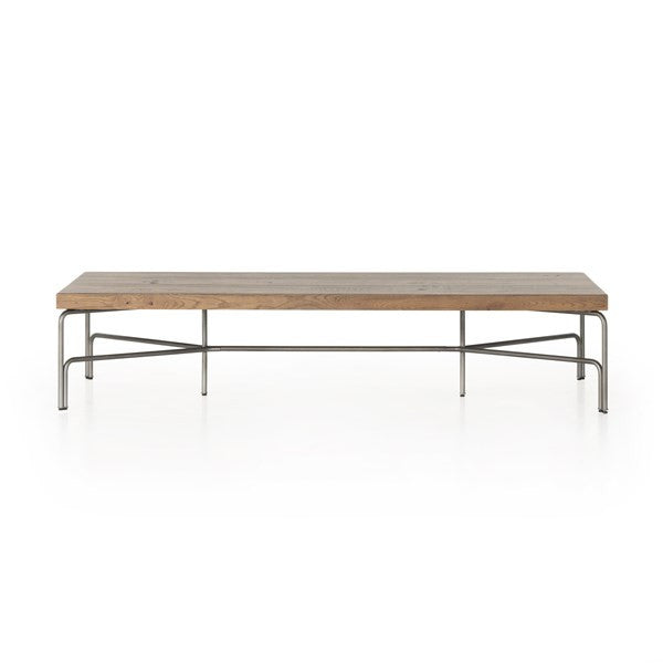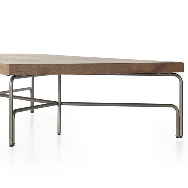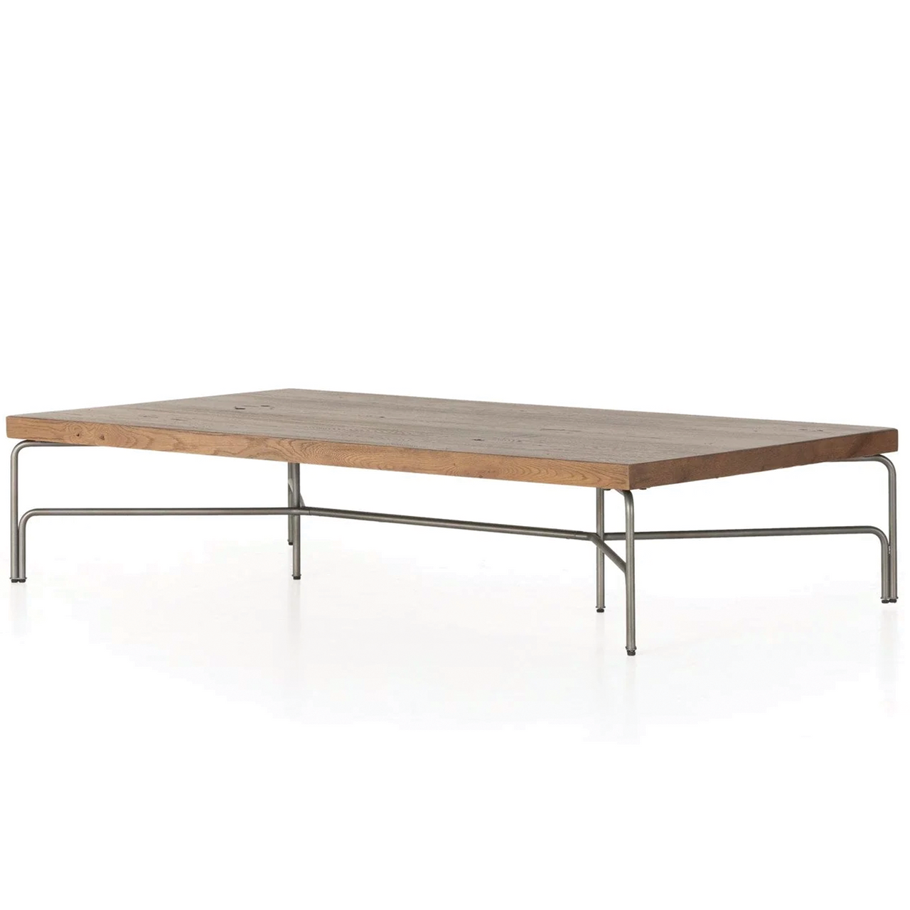 Supported by a tubular iron base finished in a brushed gunmetal, a tabletop of resawn oak anchors the living room in style. Designed in partnership with longtime Four Hands collaborator Thomas Bina and Brazilian designer Ronald Sasson.