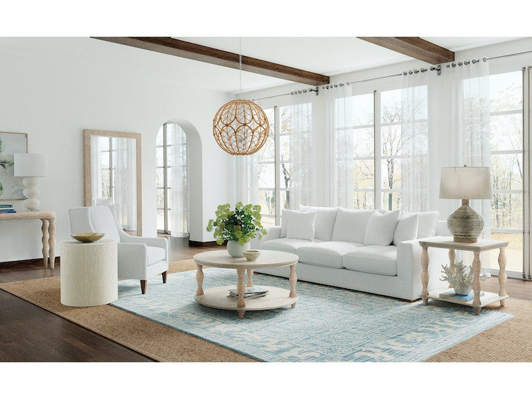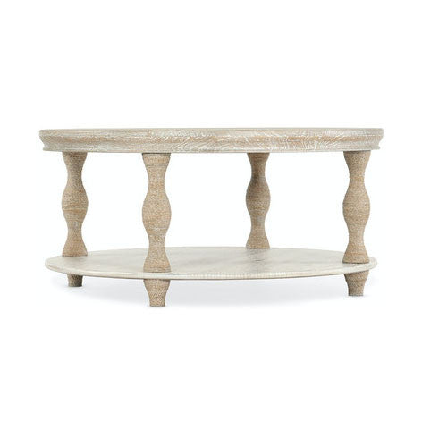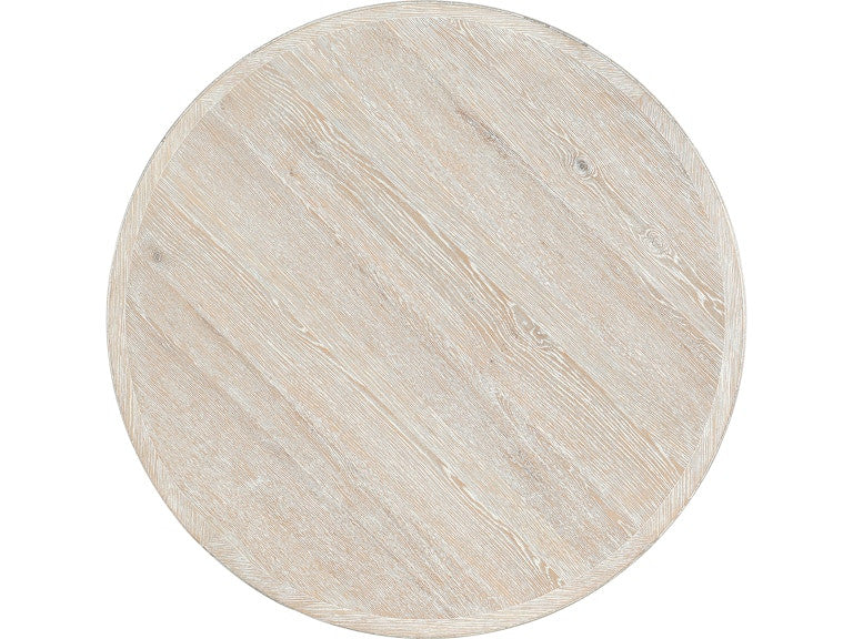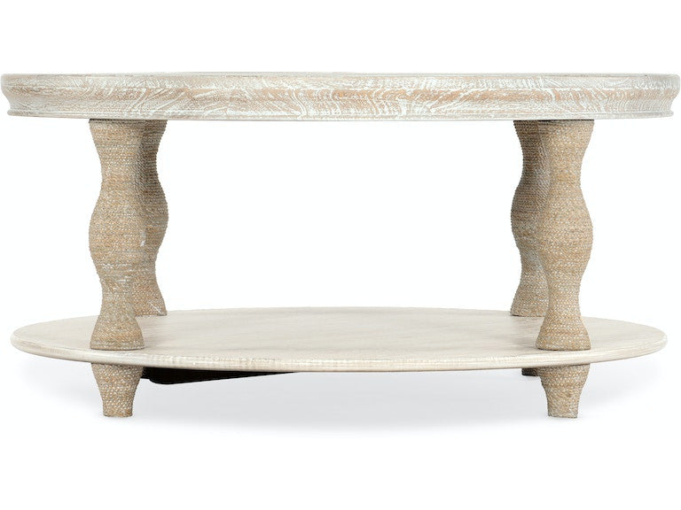 With a refreshing nautical appeal, the Bahari Round Cocktail Table combines shaped legs wrapped in whitewashed rope with the light and airy wire-brushed Surf finish over Oak Veneers for a look inspired by casual waterfront living. One fixed shelf. Designed to create a comfortable and inviting retreat within the home, the Serenity collection is defined by its casual finishes and variety of organic textures and materials that combine to deliver a relaxed aesthetic.
