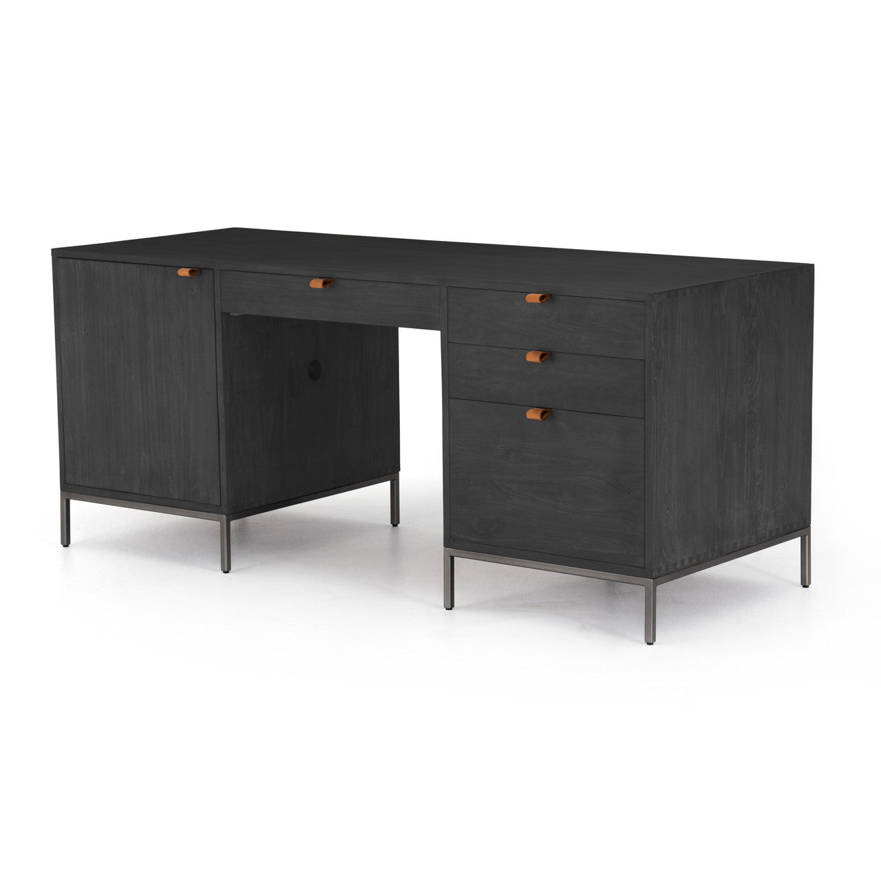 Inspired by clean mid-century design, black-washed poplar offers plenty of desk storage by way of spacious drawers including one perfectly sized for file storage of legal and letter sized documents. Metal-secured leather pulls add a textural element of surprise. Cutouts for cord management.