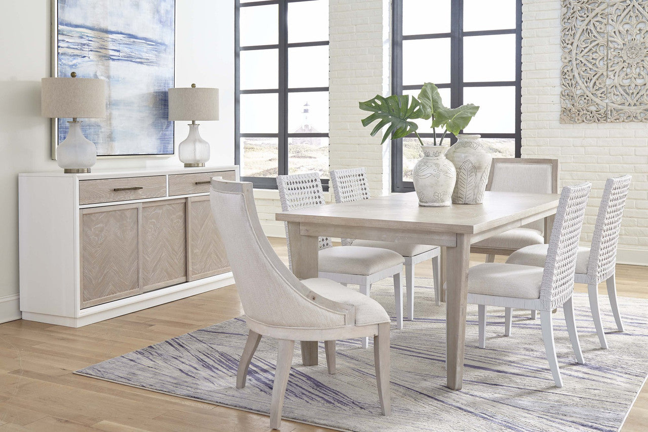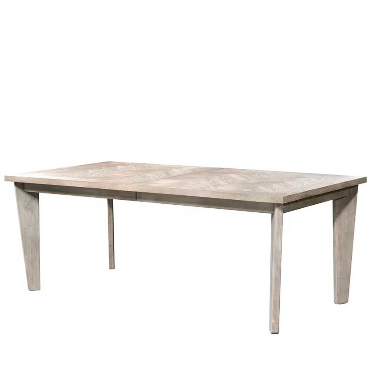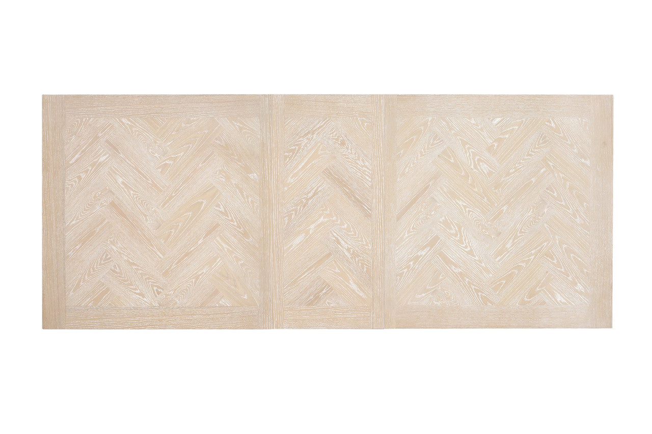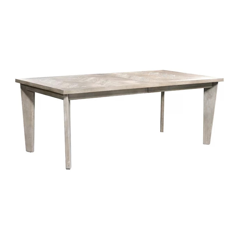 The Cathedral Oak Veneer Dining Table is a modern beach-style piece that exudes elegance and sophistication. The table features a parquet pattern top, giving it a unique and stylish appearance. The soft sand wire-brush finish adds a touch of warmth and texture to the design, while the 20" leaf accentuates the natural beauty of the wood. This dining table is perfect for those who appreciate a blend of contemporary and coastal elements in their home decor.