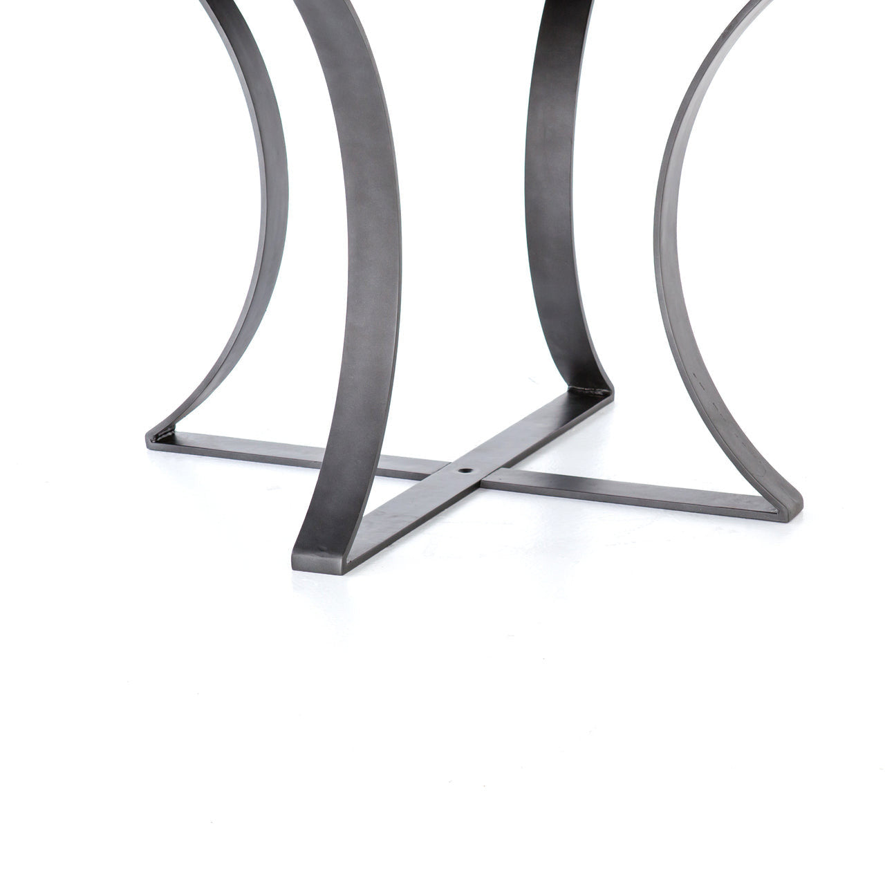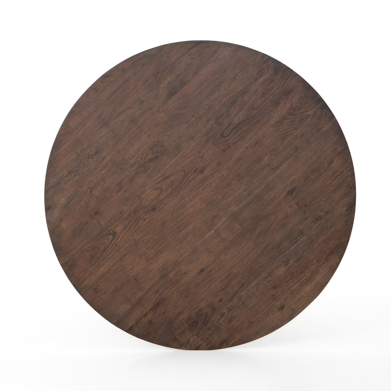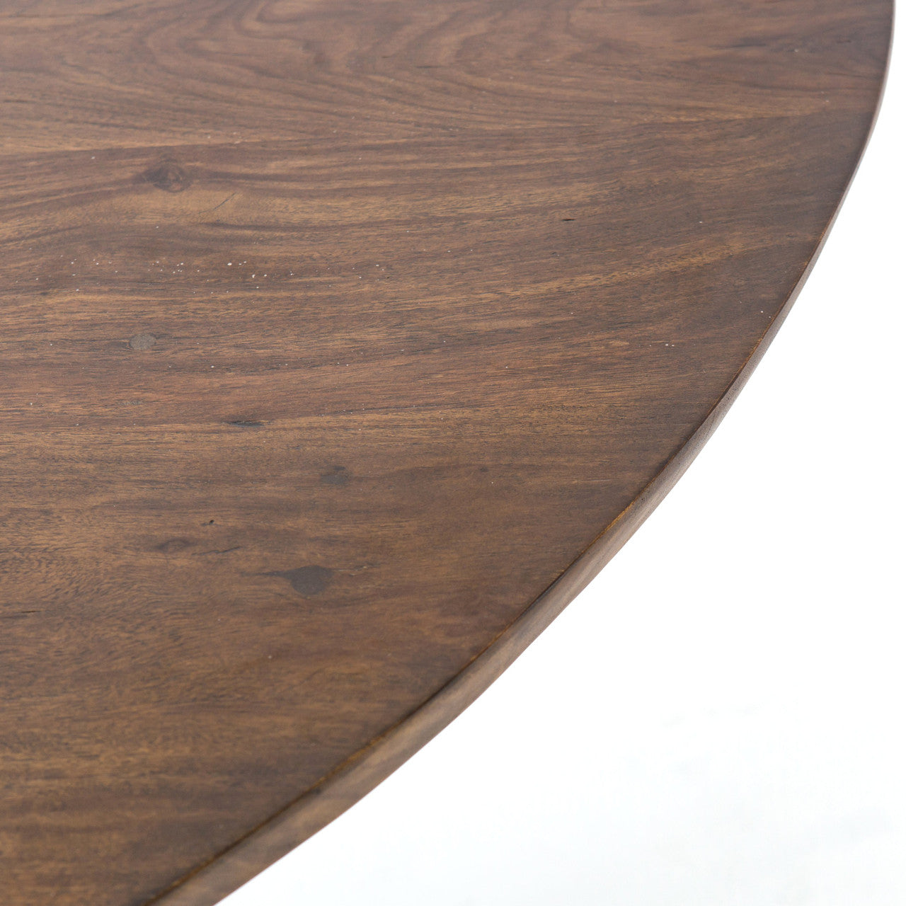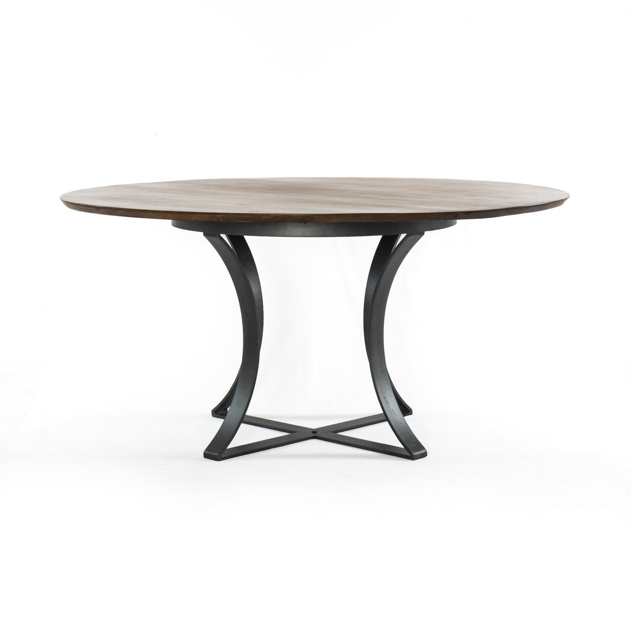 A chic, artistic design showcases the natural ambiance of this modern round dining table. Earth-inspired materials feature a tanner brown finish reclaimed acacia wood top with natural grain markings, and a whimsical curved base made of gunmetal finish iron strips. Modern and engaging, this round table offers a forward-thinking method of repurposing earthy attitude with contemporary energy.