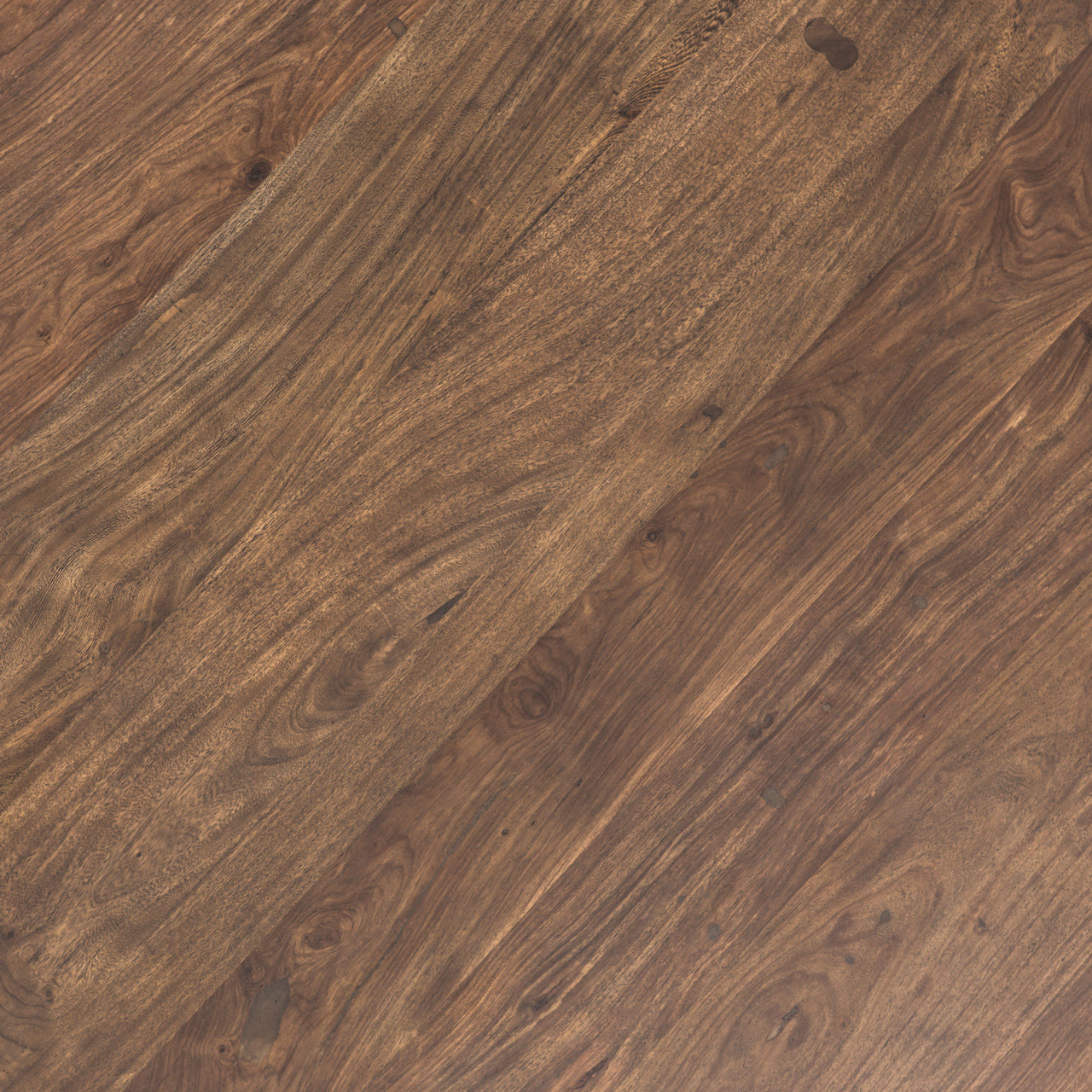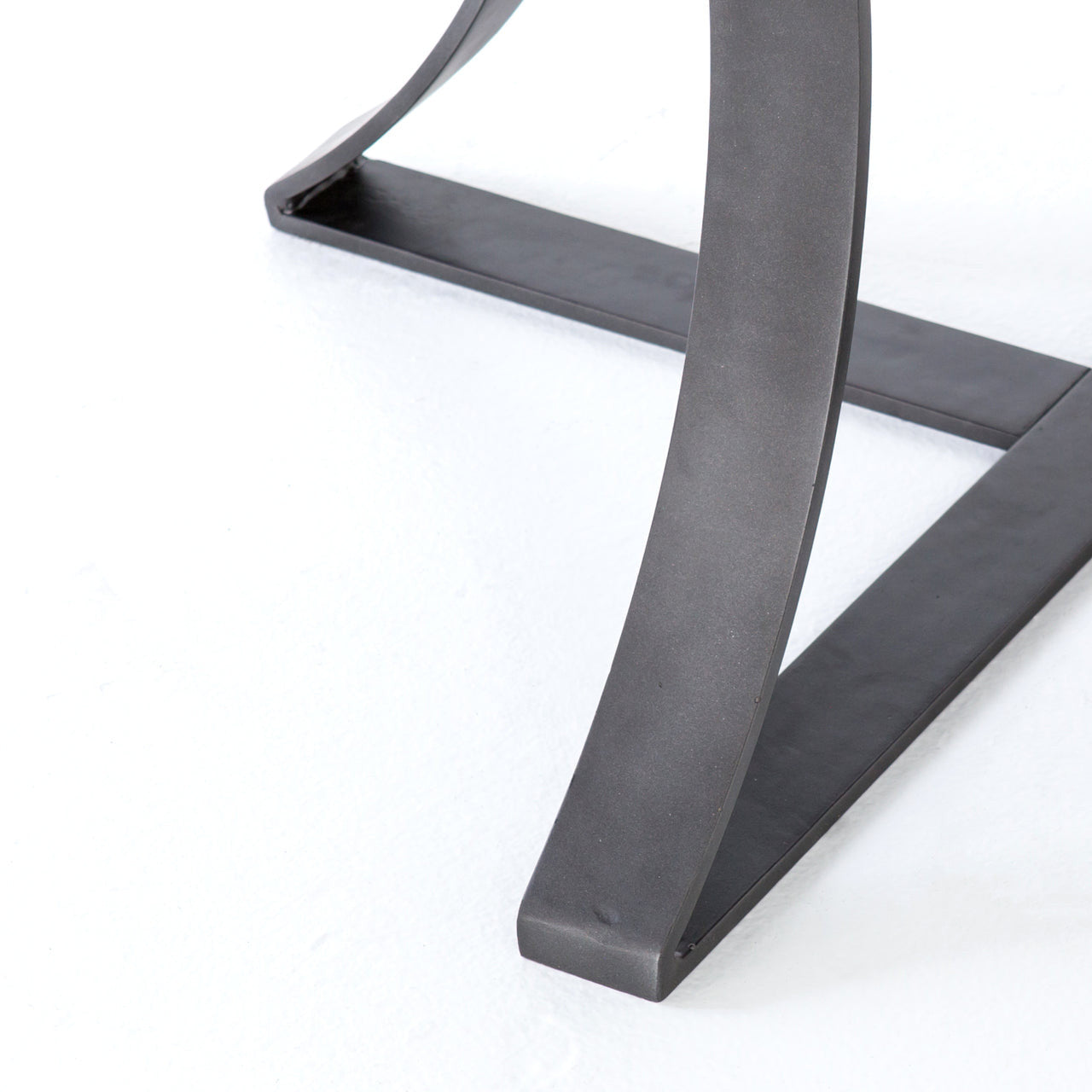 Gunmetal finish over iron base. Tanner brown acacia finish over mixed reclaimed wood top.