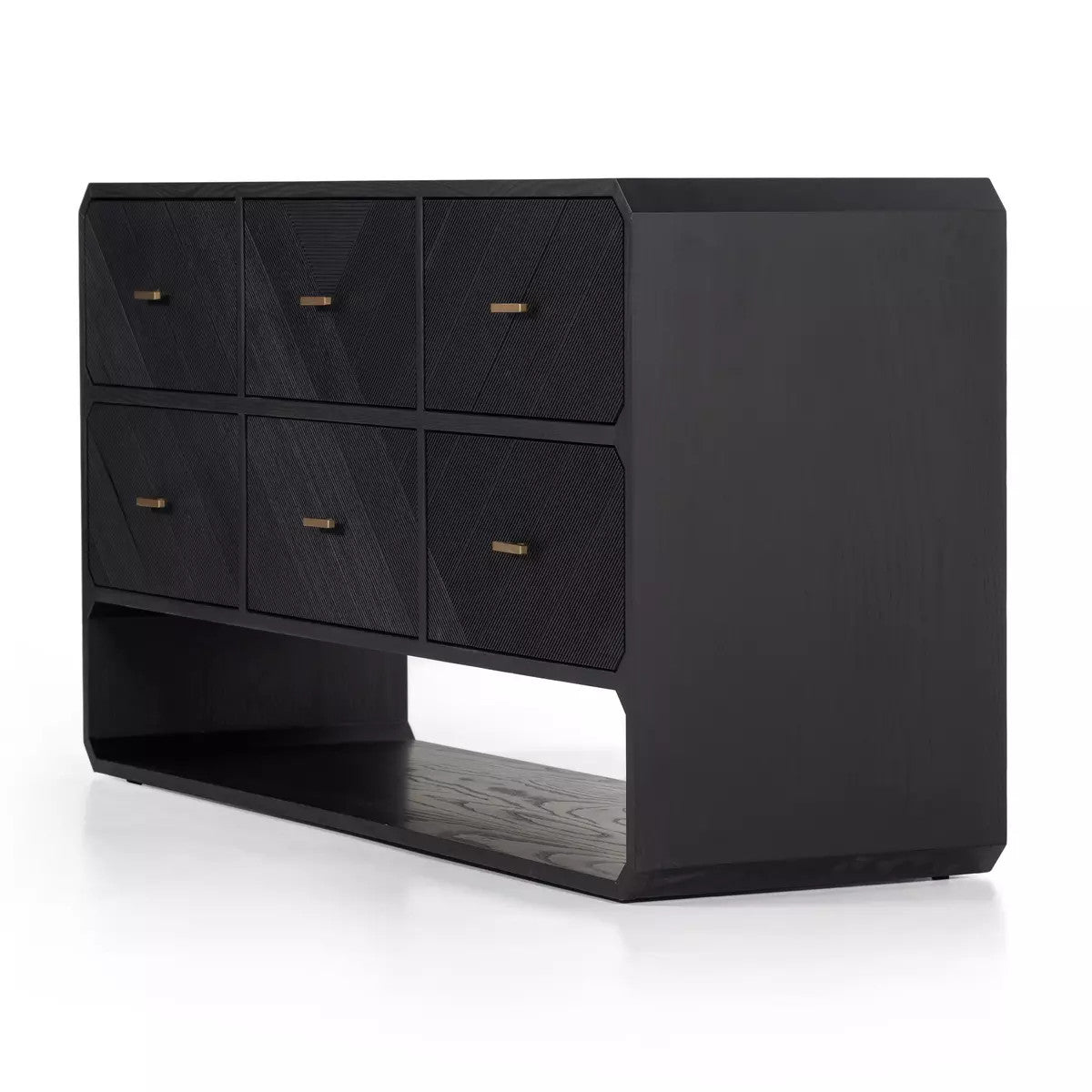 Modern dresser, sleek and timeless design with plenty of storage. Black ash veneer with satin brass handles.