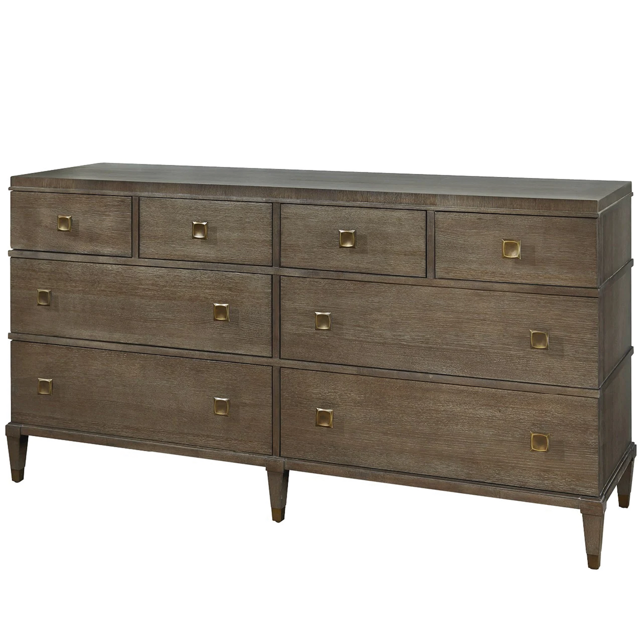 The Playlist Dresser by Universal Furniture, featuring a Brown Eyed Girl finish, showcases a modern and rustic design. Crafted with oak veneers displaying alternating grains for a distinctive look and hardwood solids, this dresser offers a blend of classic style and modern functionality. With eight drawers, including a drop front with full extension metal guides and a jewelry tray insert, this dresser provides ample storage and practicality for the contemporary home.