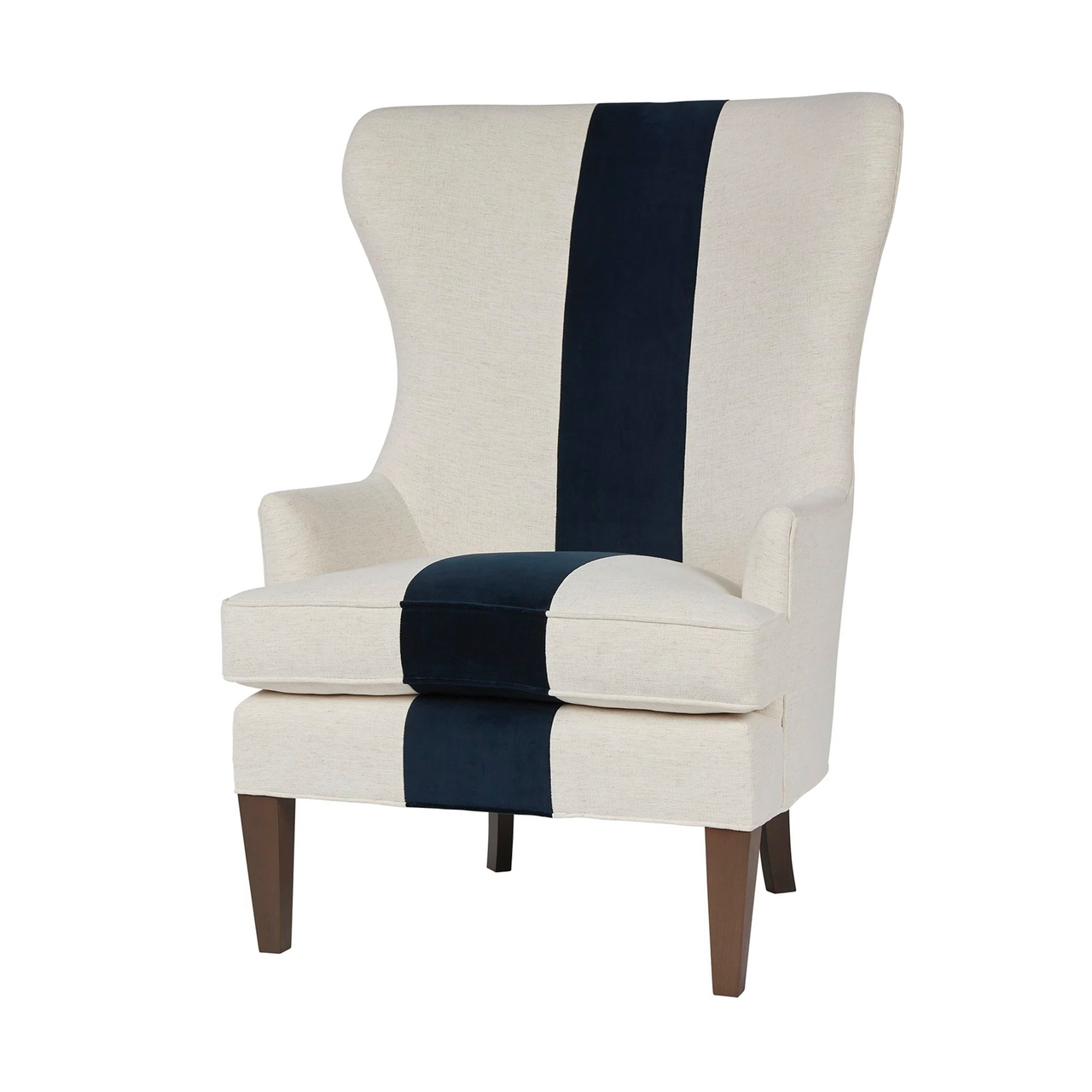 A daring, vertical navy stripe defines the Surfside Wing Chair, a regal upholstery furnishing featuring an exaggerated back and tapered legs.
