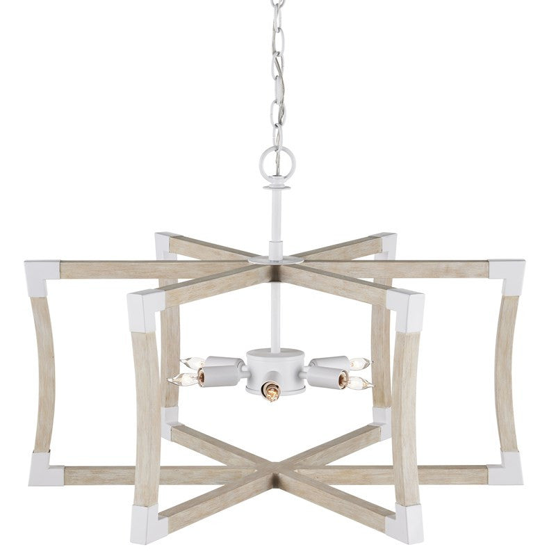 The Arts & Crafts movement inspired the design of the Bastian Small Sandstone Lantern, which is made of wrought iron and wood in sugar white and sandstone finishes. The crisp feel of the white metal clasping the spokes of washed wood brings extra sophistication to this lantern-shaped chandelier.