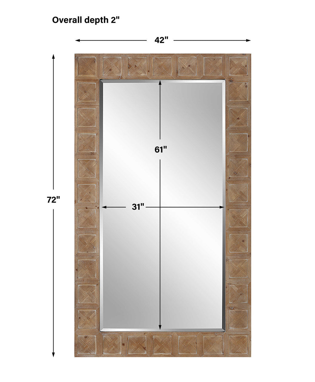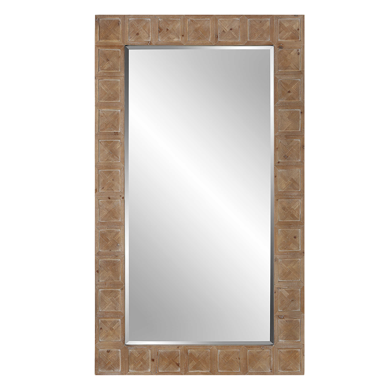 Lending itself to rustic lodge and farmhouse styles, this rectangular mirror is crafted from solid Fir wood with crossed inlay details around the frame and a light white wash that accentuates the natural wood grain. Mirror has a 1 1/4" bevel and may be hung horizontal or vertical. Due to the nature of natural materials, each piece may have slight variations.