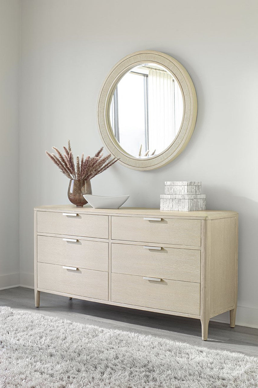 A beautifully handcrafted piece that seamlessly blends transitional style with natural elegance. Made from white oak veneer and wrapped in 6mm paper rope, it exudes a soft and inviting light sand finish, achieved through a meticulous wired brush technique. This versatile mirror can be easily mounted to a dresser, adding both functionality and visual charm to any space. Elevate your decor with this unique and artisanal accent.