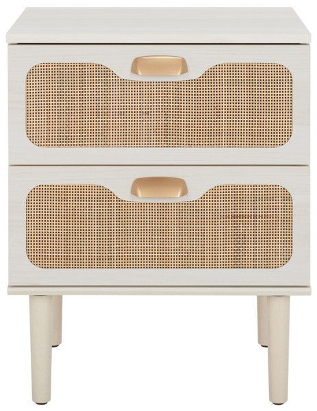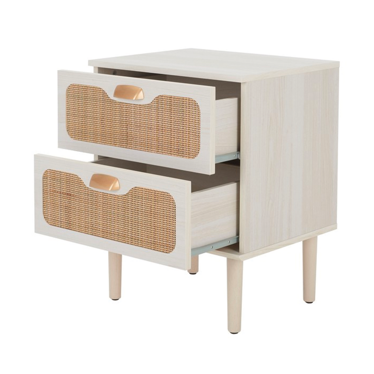 Completed with sleek metal pulls, our nightstand combines timeless aesthetics with an airy and breezy look. It features two roomy drawers to keep all your belongings and essentials organized behind its elegant and inviting facade.