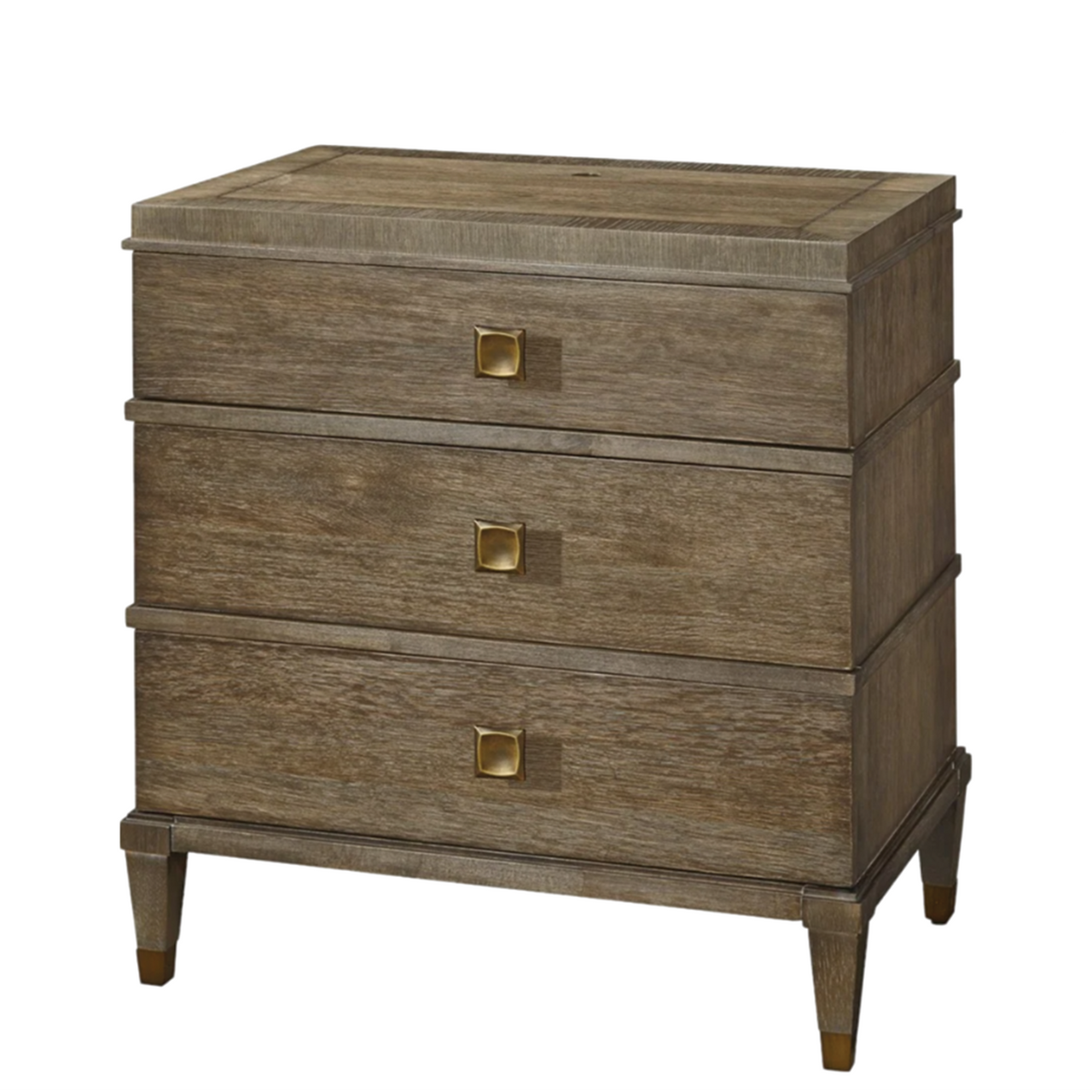 A modern take on a bedside staple, this nightstand features a hidden panel on top that opens to reveal three outlets. Metal hardware brings a touch of glamour, complemented by the metal ferrules on the feet.