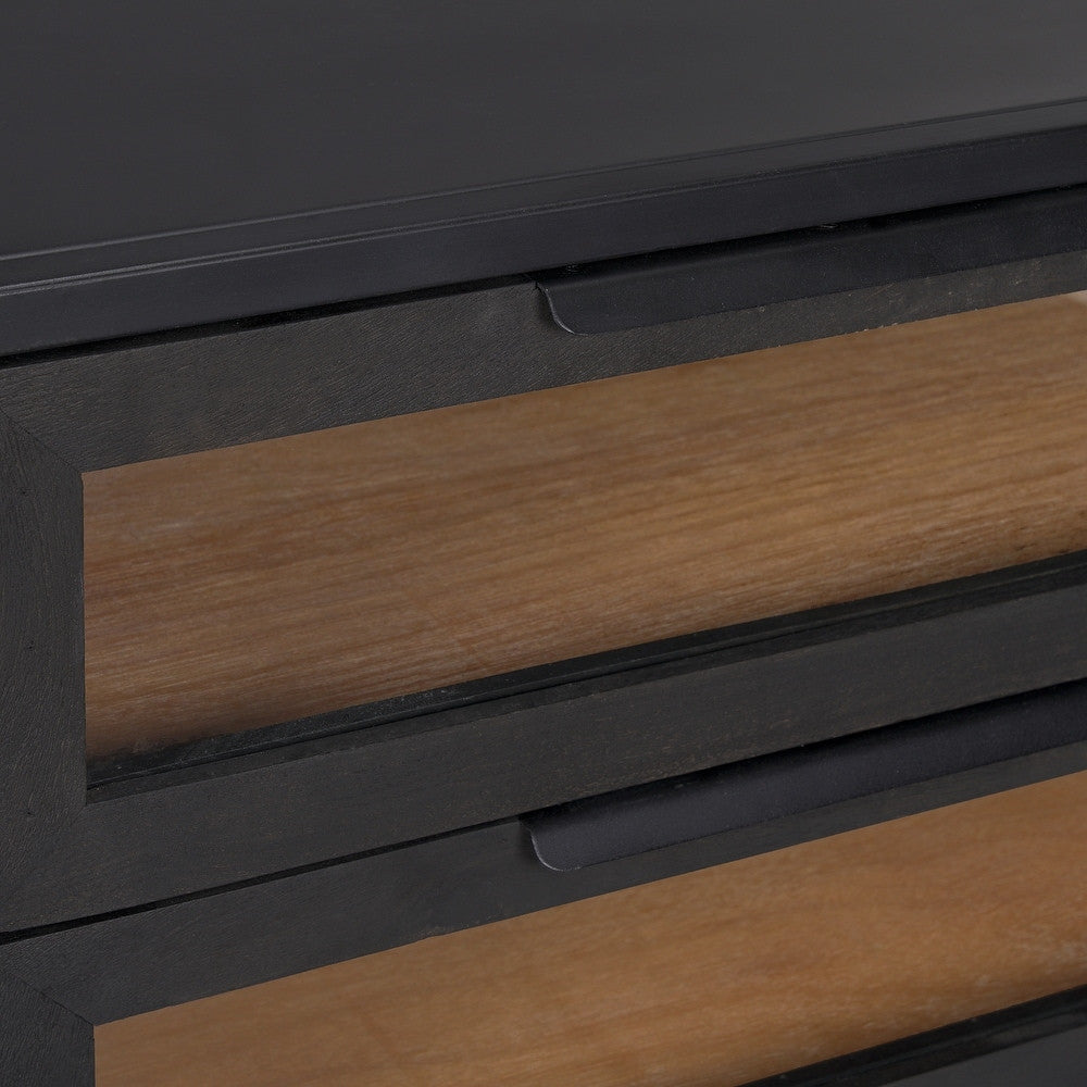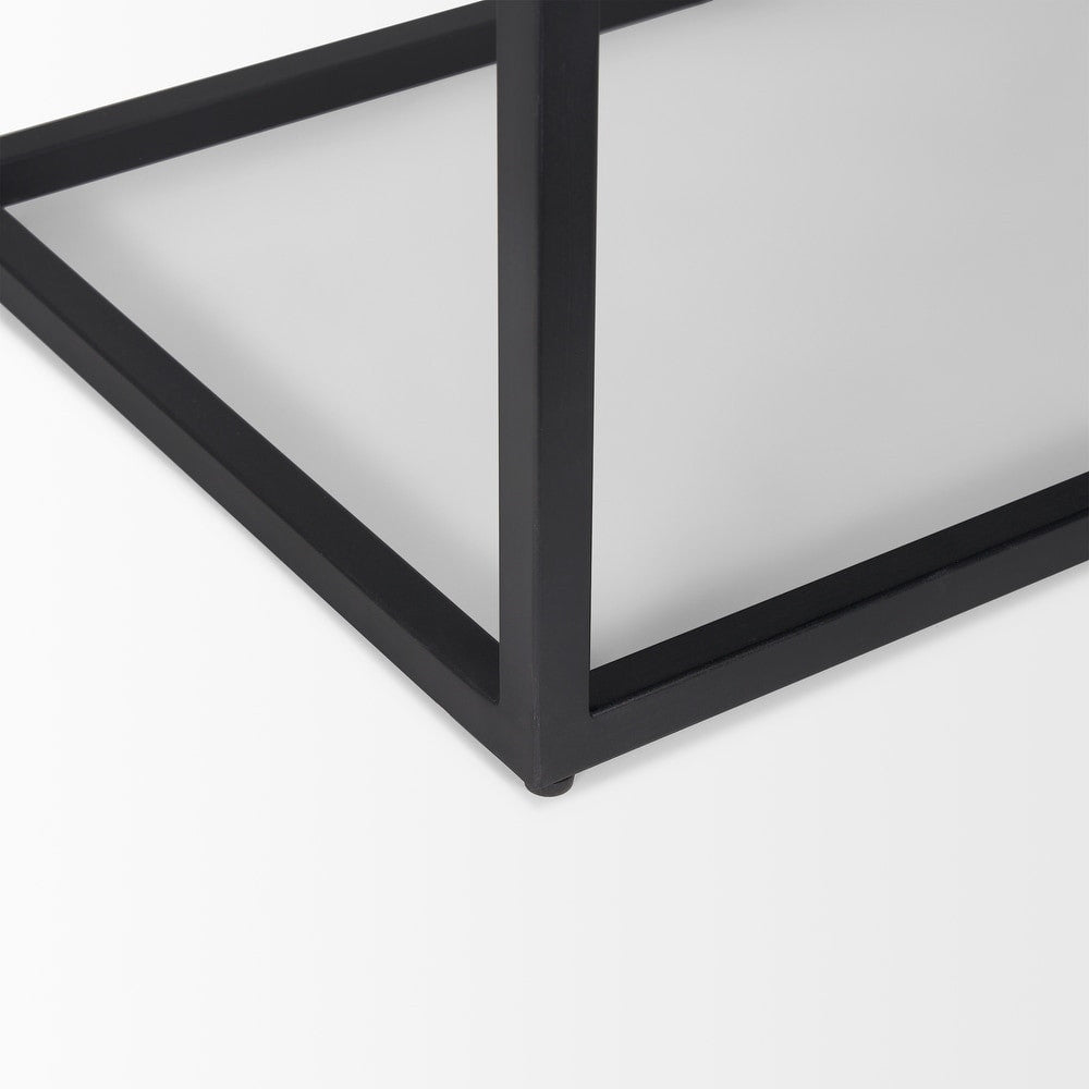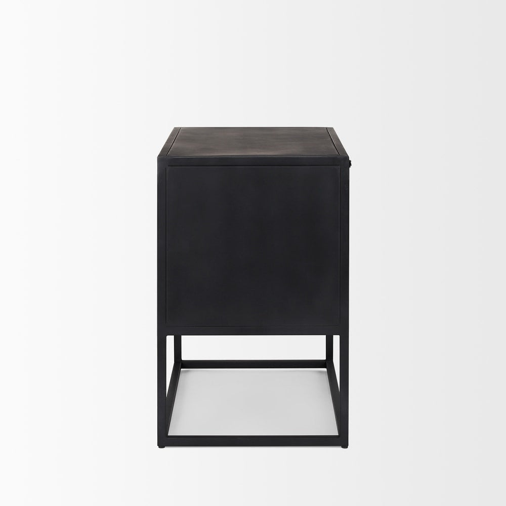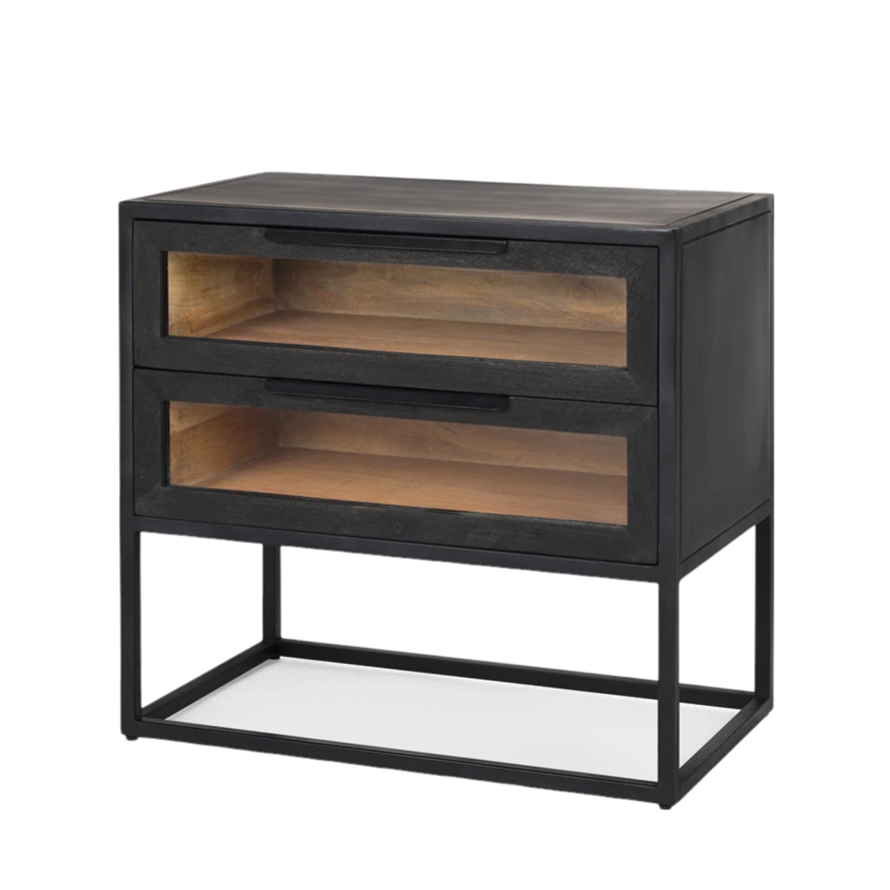 Bold, dark and chunky, just the way we like our Sloan Side Table. This confident showpiece is perfect for themed interiors such as the modern farmhouse, industrial or urban loft look and feel. The cabinet itself is made from a sturdy black iron, which sits atop a sleek iron base. It is fronted by dark, solid mango wood doors. The doors feature a sleek grip and tempered glass that provide a window into the lighter solid wood interior. Once opened, the cabinet reveals a beautiful medium brown inner and a removable shelf.