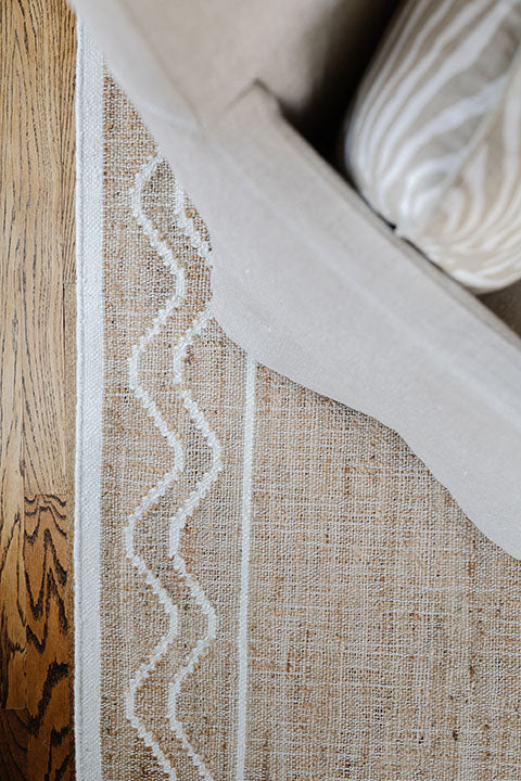 This artisan India piece is handwoven from jute and wool fibers and looks ready to bloom in your home. With ikat styles and an simplified wavy borders, it embodies the simple sophistication that feels forever classic.