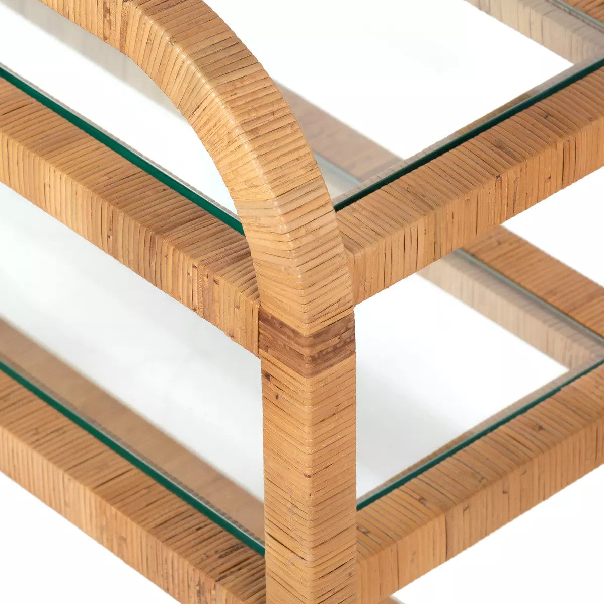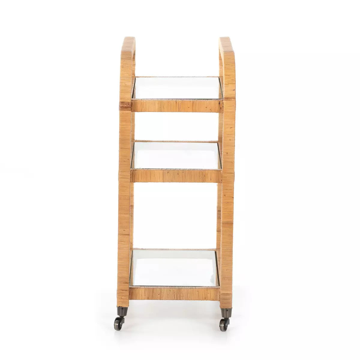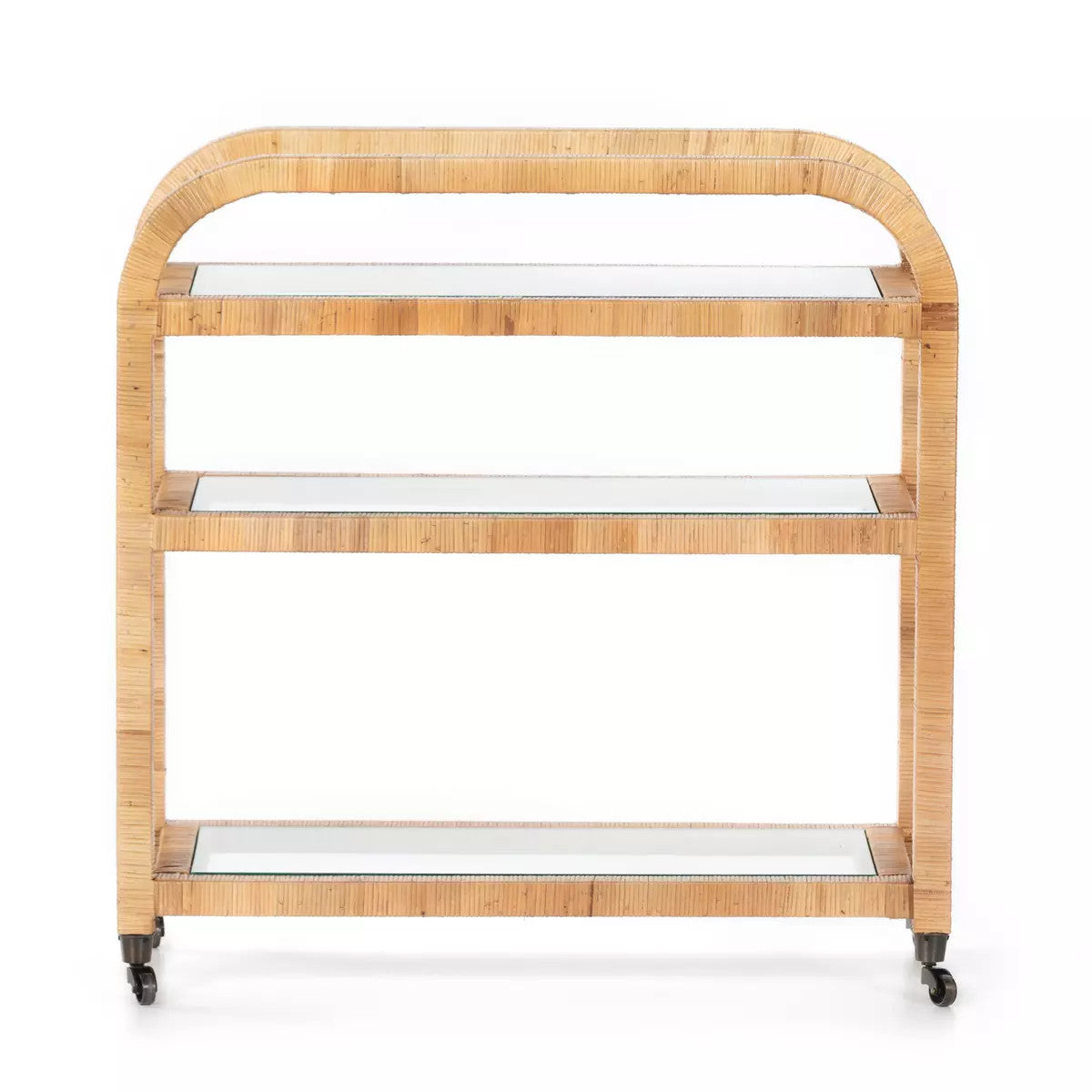 Embrace the party vibe. Reminiscent of the 1970s, is crafted from rattan with a honey finish. This unique frame supports three levels of tempered glass shelves, providing ample space for storing your favorite bottles and glassware. To add convenience, the shelving unit is equipped with casters for easy mobility.