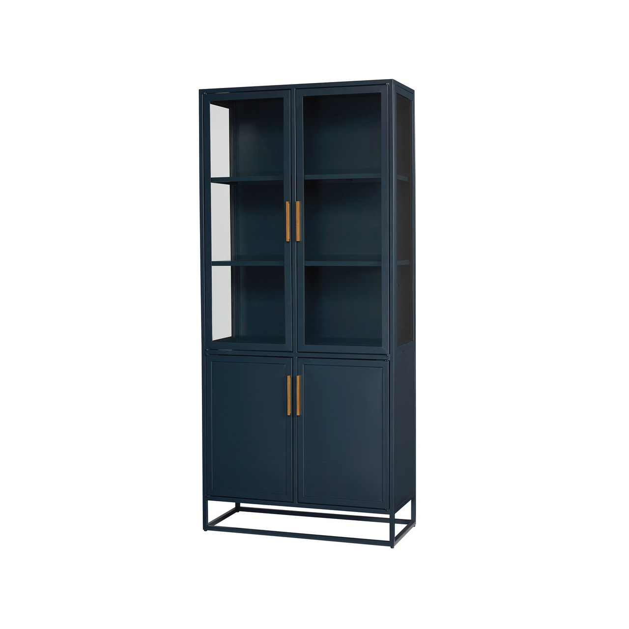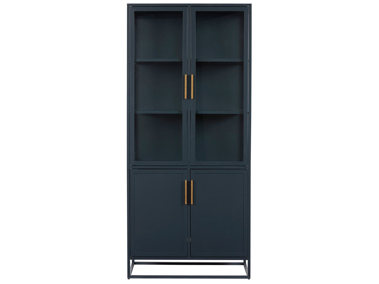Add vertical storage to living areas with the Santorini Tall Metal Kitchen Cabinet, a serenely confident piece in a deep blue finish with clear glass doors and sleek bronze bar hardware.