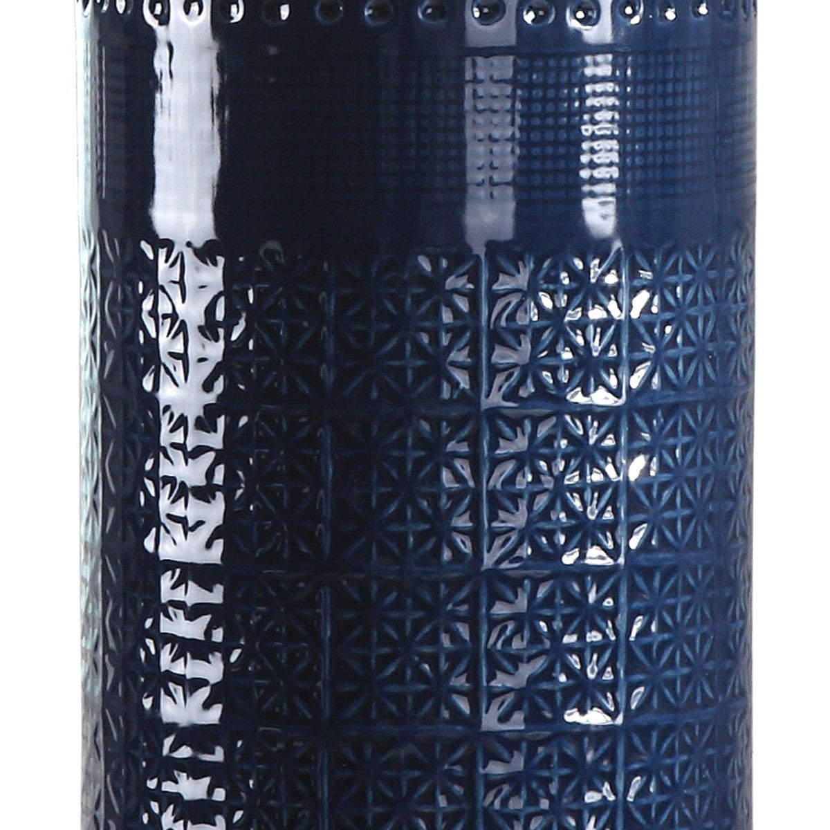 Intricately embossed ceramic finished in a royal blue glaze, accented with brushed nickel plated details. The round hardback drum shade is a white linen fabric with natural slubbing.