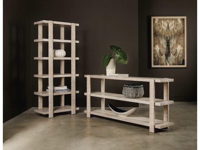 Modern and organic, the Commerce & Market Etagere brings a breath of fresh air to your space with five fixed shelves crafted of Oak Veneers in a natural light wood finish with rope-wrapped supports. Targeting the next generation of furniture buyers, Hooker Furniture unveils the Commerce & Market brand of accent and occasional pieces.
